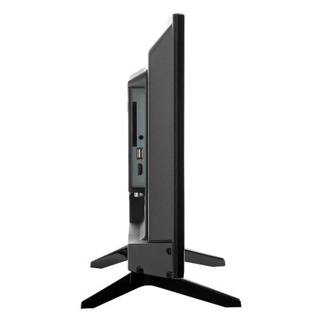 Устройство снабжено двумя стереодинамиками общей мощностью 10 Вт, цифровым тюнером DVB T/T2/C. Для подключения дополнительного оборудования используются вход HDMI, порт USB Type-A, разъем 3,5 мм. Эта модель поддерживает запись эфирных трансляций на USB-носители. В комплекте — настольная подставка. Для размещения на стене потребуется приобрести крепление VESA 75х75.