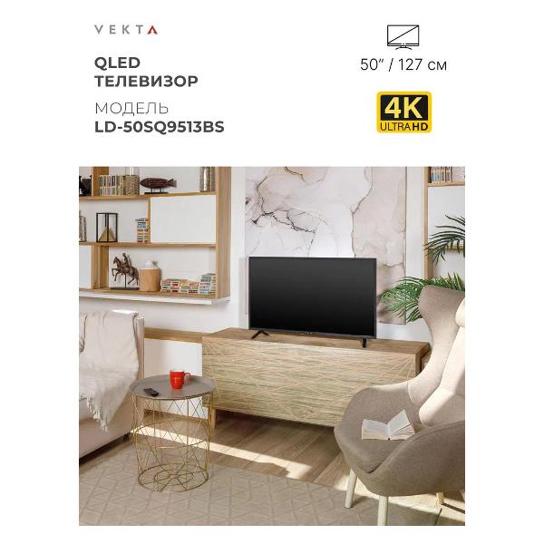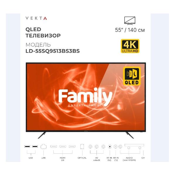 Vekta LD-50SQ9513BS укомплектован настольной подставкой, для размещения на стене используется крепление VESA 200х200 (приобретается отдельно). В корпус интегрированы три входа HDMI, два порта USB Type-A, разъемы LAN, для модуля DVB CAM и 3,5 мм для наушников. Для выхода в интернет и синхронизации с мобильными девайсами можно использовать модуль Wi-Fi.