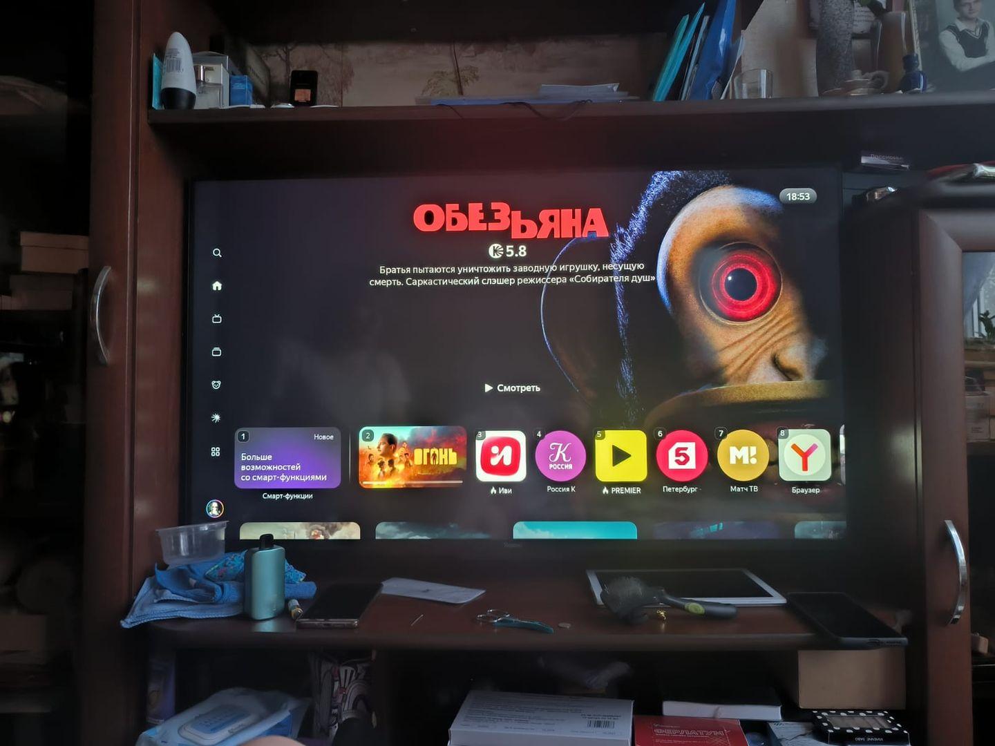 тусклый экран,настроек телевизора мало,если пульт сломается его не где купить,Алиса откликается плохо не так как на станции,блютуза нет,кнопок в помогающих нет,если пульт сломается,для наушников нет гнезда.Теперь думаем за сколько его перепродать?