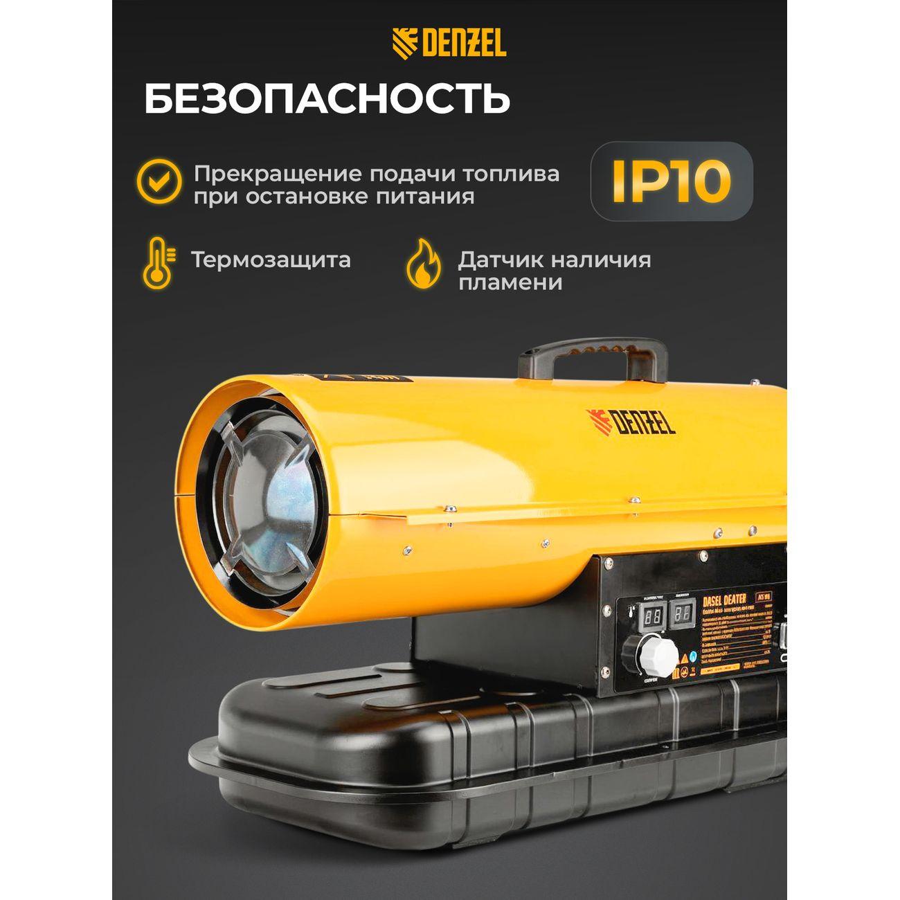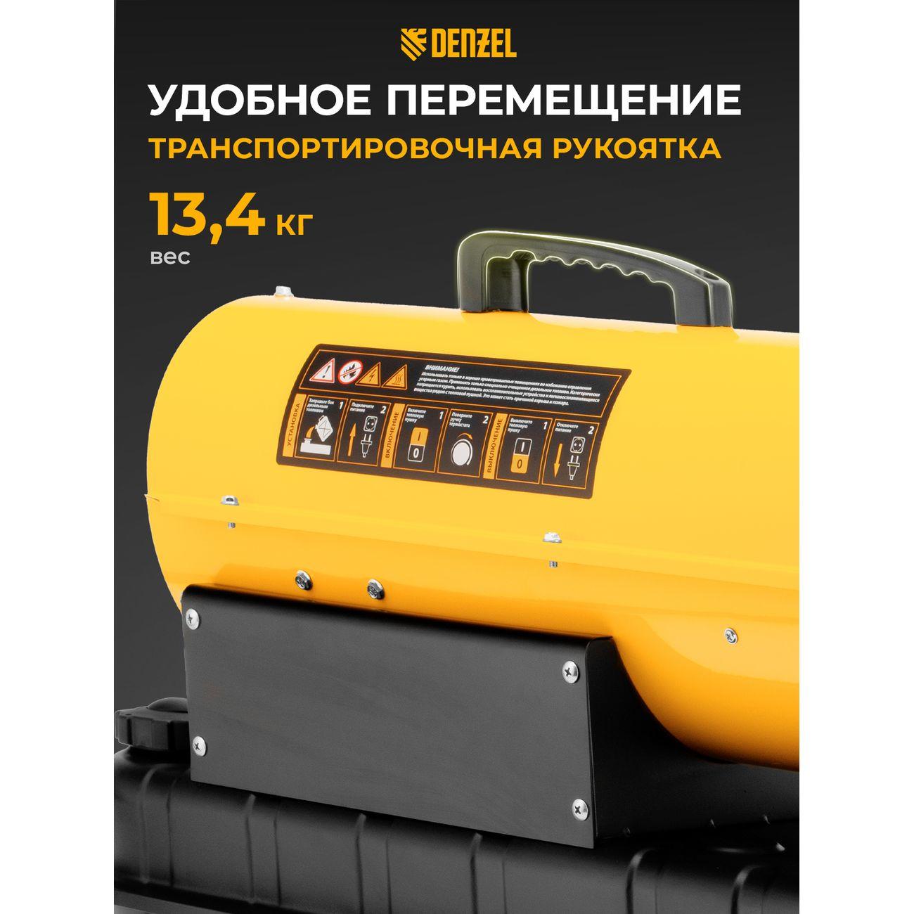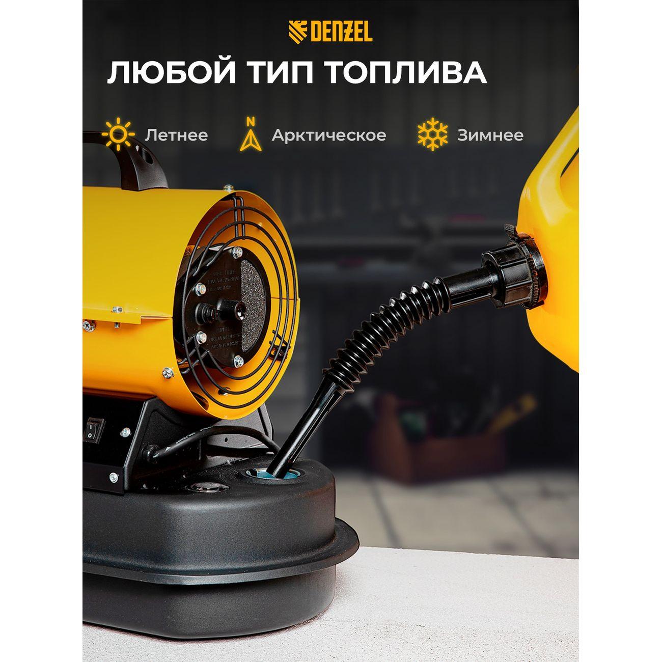 Тепловая пушка Denzel DHG-20, желтая — модель мощностью 20 кВт, использующая дизельное топливо. Объем бака составляет 12 л, расход — 1,8 л в час, способ нагрева прямой, что ускоряет процесс. Рекомендованная площадь обогрева — до 200 м², устройство предназначено для установки в нежилых помещениях: ангарах, цехах и других. Кроме того, тепловые пушки применяются для просушивания стен и решения других задач во время ремонтно-строительных работ. Предусмотрен теплоотражающий экран для равномерного распределения тепла.