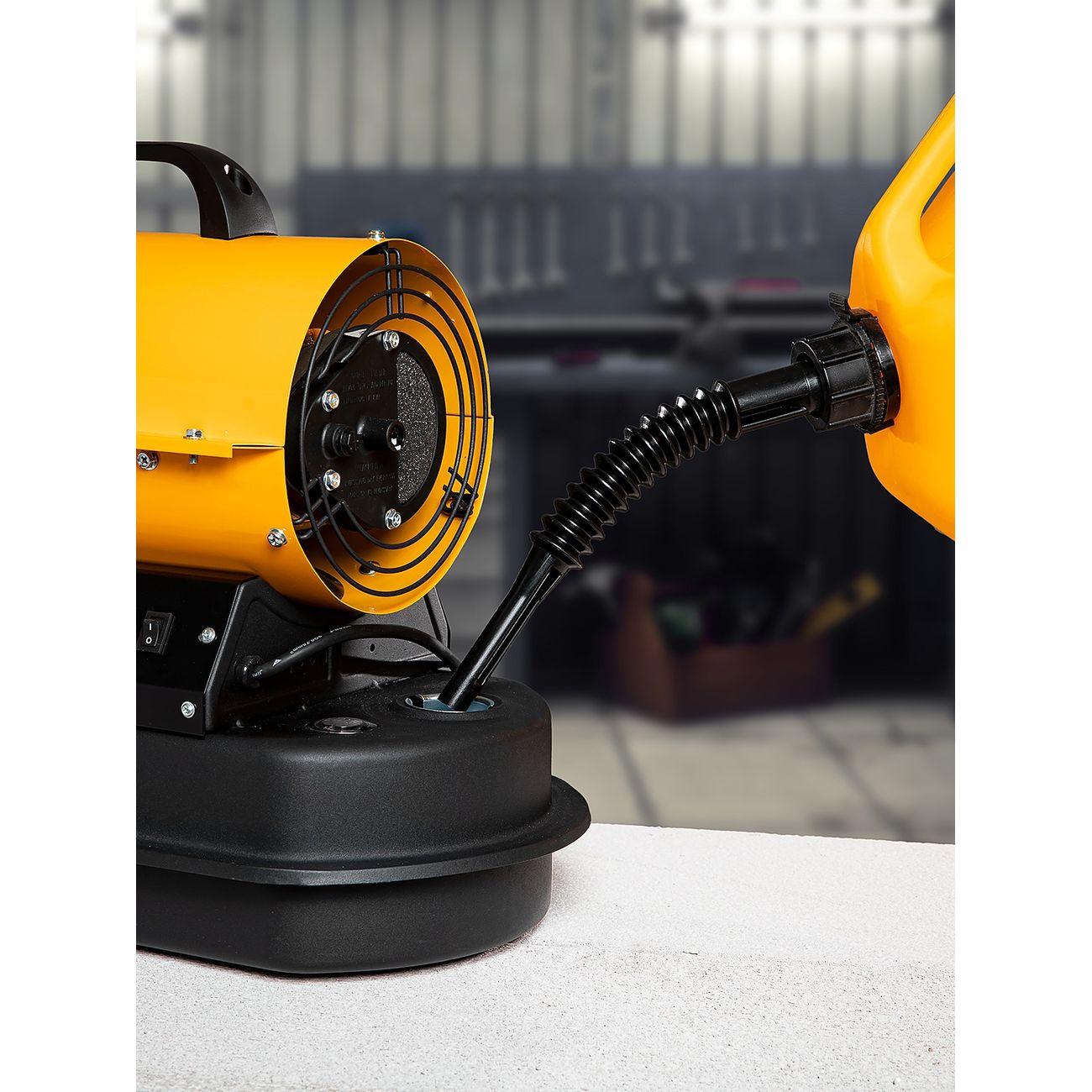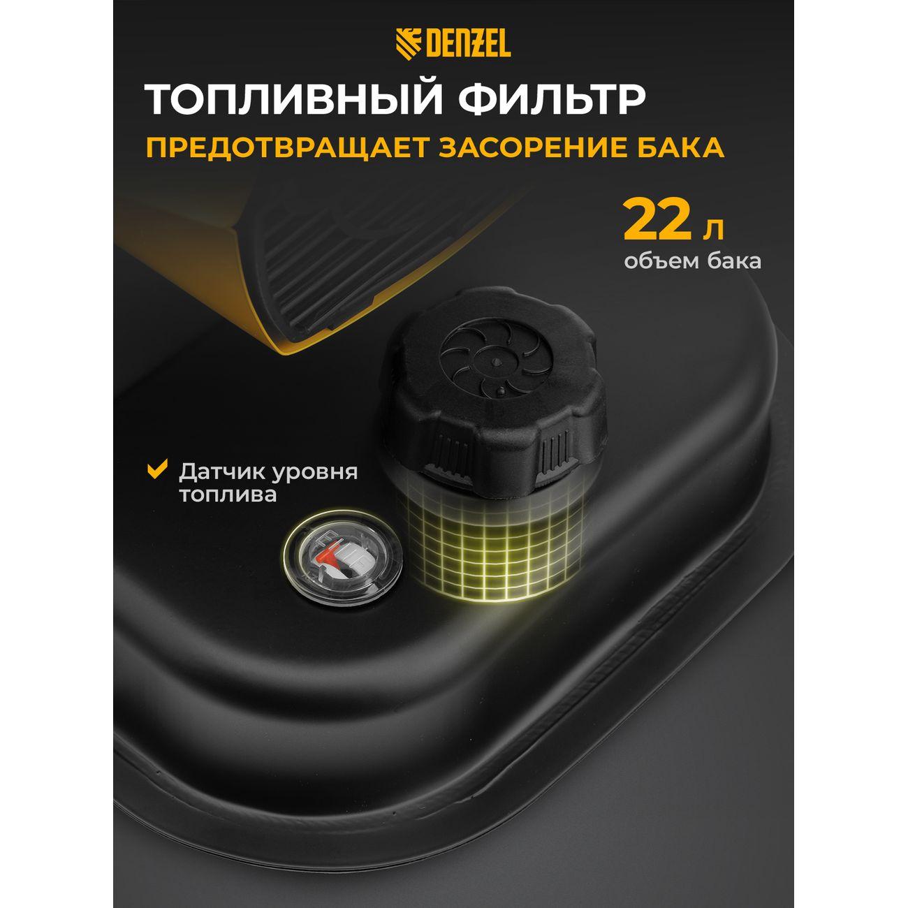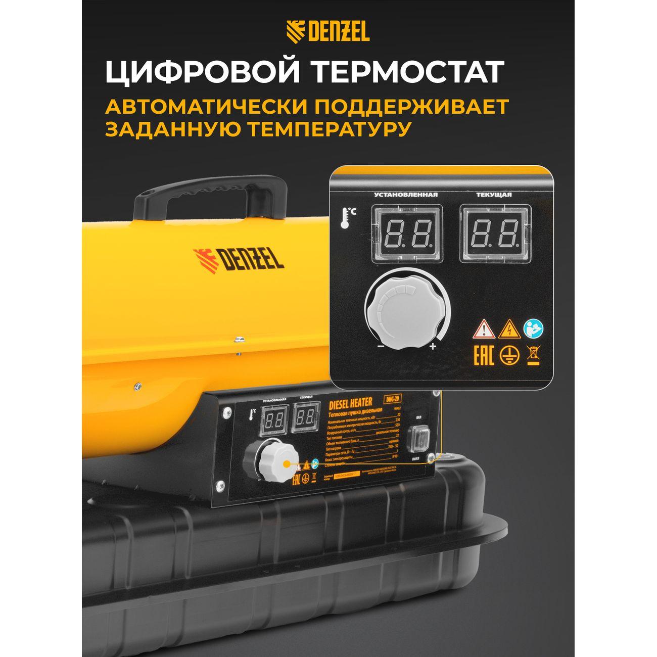 Тепловая пушка Denzel DHG-20, желтая — модель мощностью 20 кВт, использующая дизельное топливо. Объем бака составляет 12 л, расход — 1,8 л в час, способ нагрева прямой, что ускоряет процесс. Рекомендованная площадь обогрева — до 200 м², устройство предназначено для установки в нежилых помещениях: ангарах, цехах и других. Кроме того, тепловые пушки применяются для просушивания стен и решения других задач во время ремонтно-строительных работ. Предусмотрен теплоотражающий экран для равномерного распределения тепла.