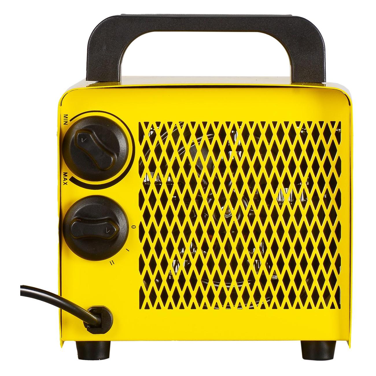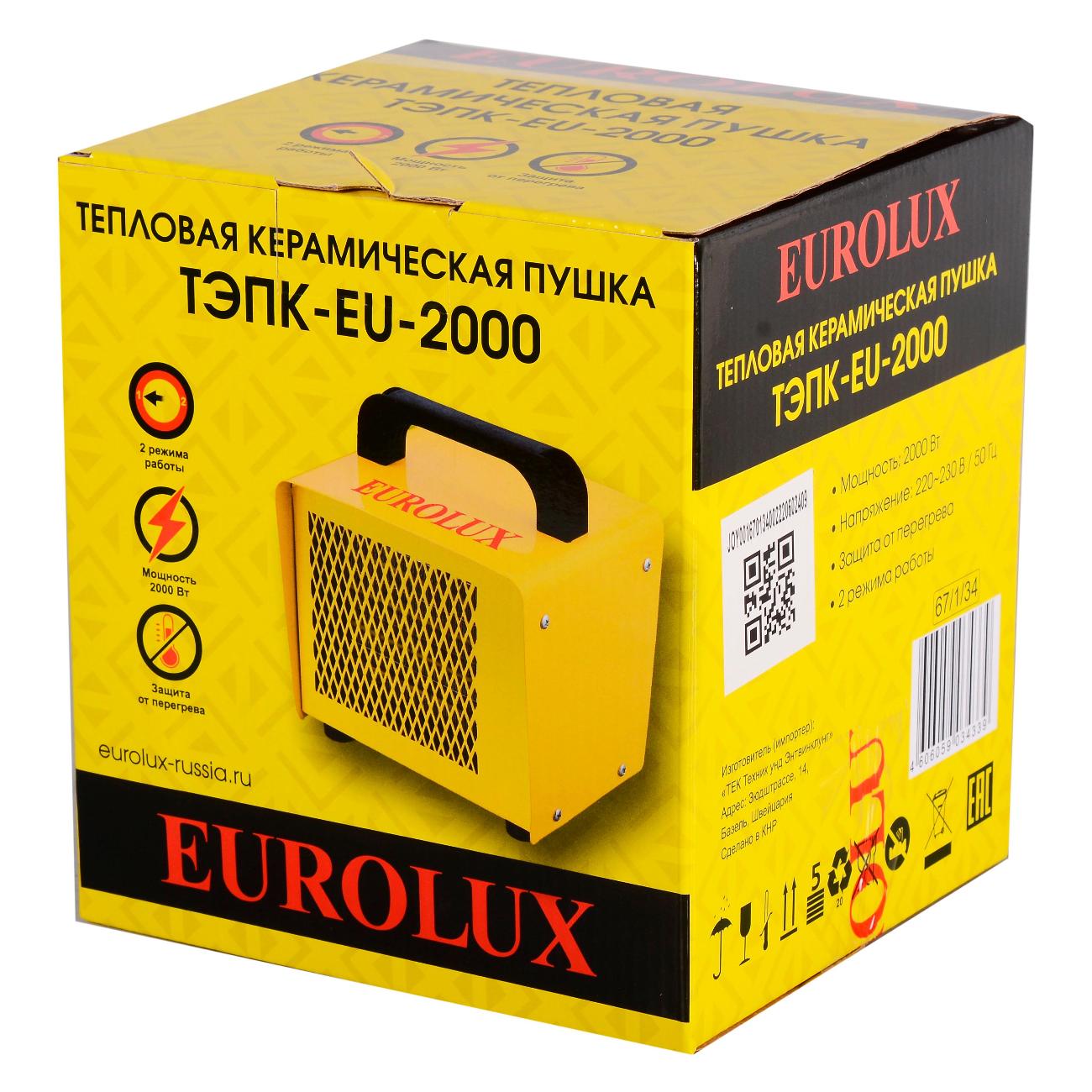 Тепловая пушка Eurolux ТЭПК-EU-2000 размером 28х25х28 см весит 1,3 кг и потребляет до 2 кВт электроэнергии. Модель работает тихо: уровень шума не превышает 40 дБ, что дает возможность использовать электроприбор во время учебы или отдыха. Устройство управляется механическими поворотными переключателями сбоку, которыми можно выбрать один из двух режимов действия, включая поддержку текущей температуры. Световые индикаторы показывают заданные параметры. Ножки с нескользящей поверхностью обеспечивают устойчивость. Переносить электроприбор можно за ручку эргономичной формы.