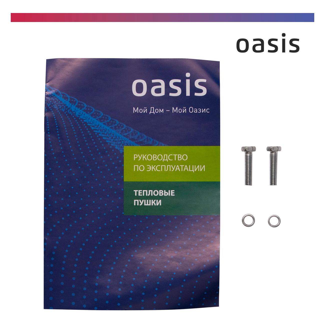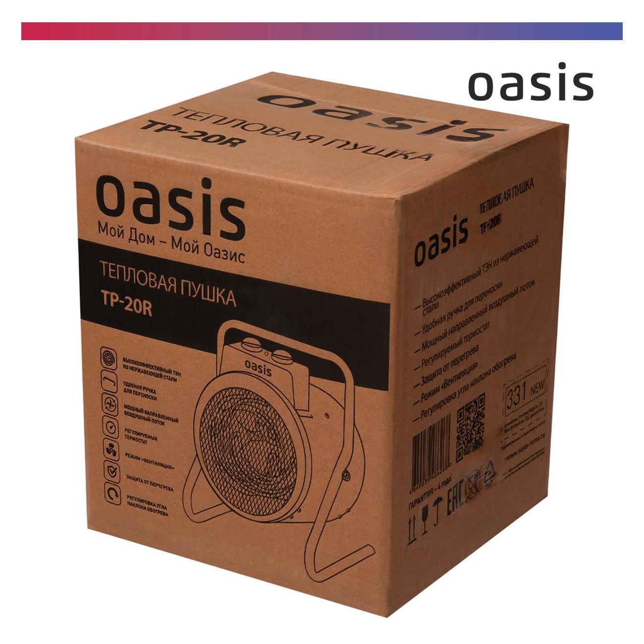 Oasis TP-20R — тепловая пушка мощностью 2000 Вт предназначена для обогрева помещений до 20 м². Нагревательный элемент из нержавеющей стали быстро выходит на рабочую температуру.