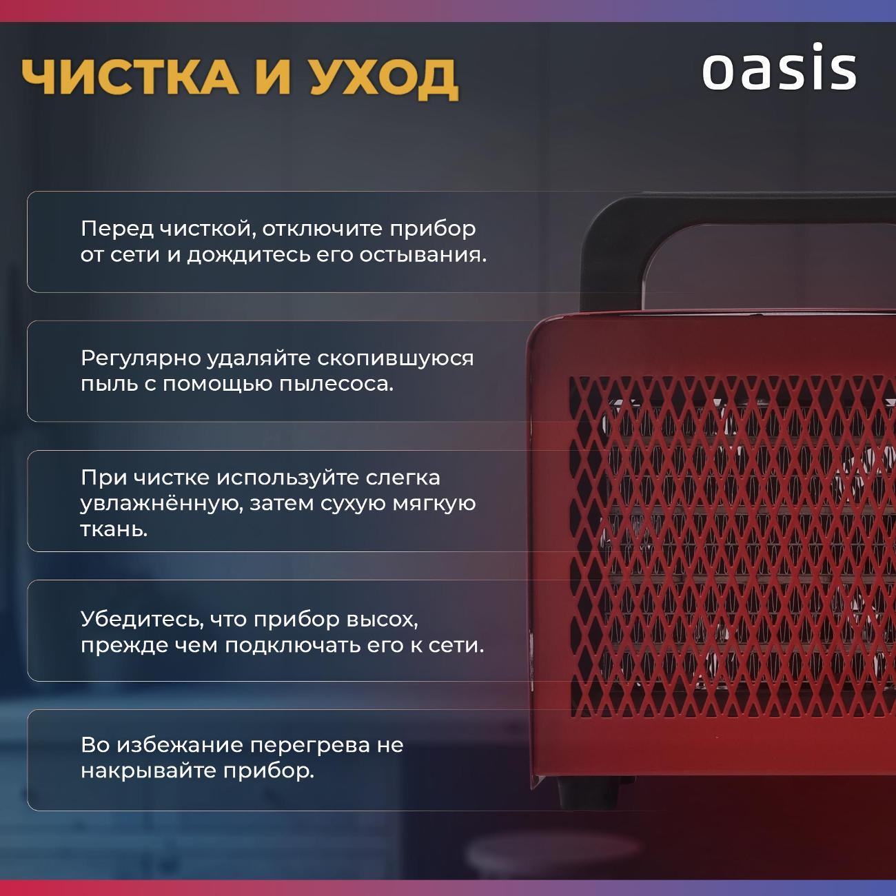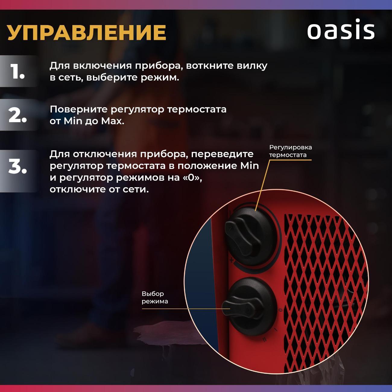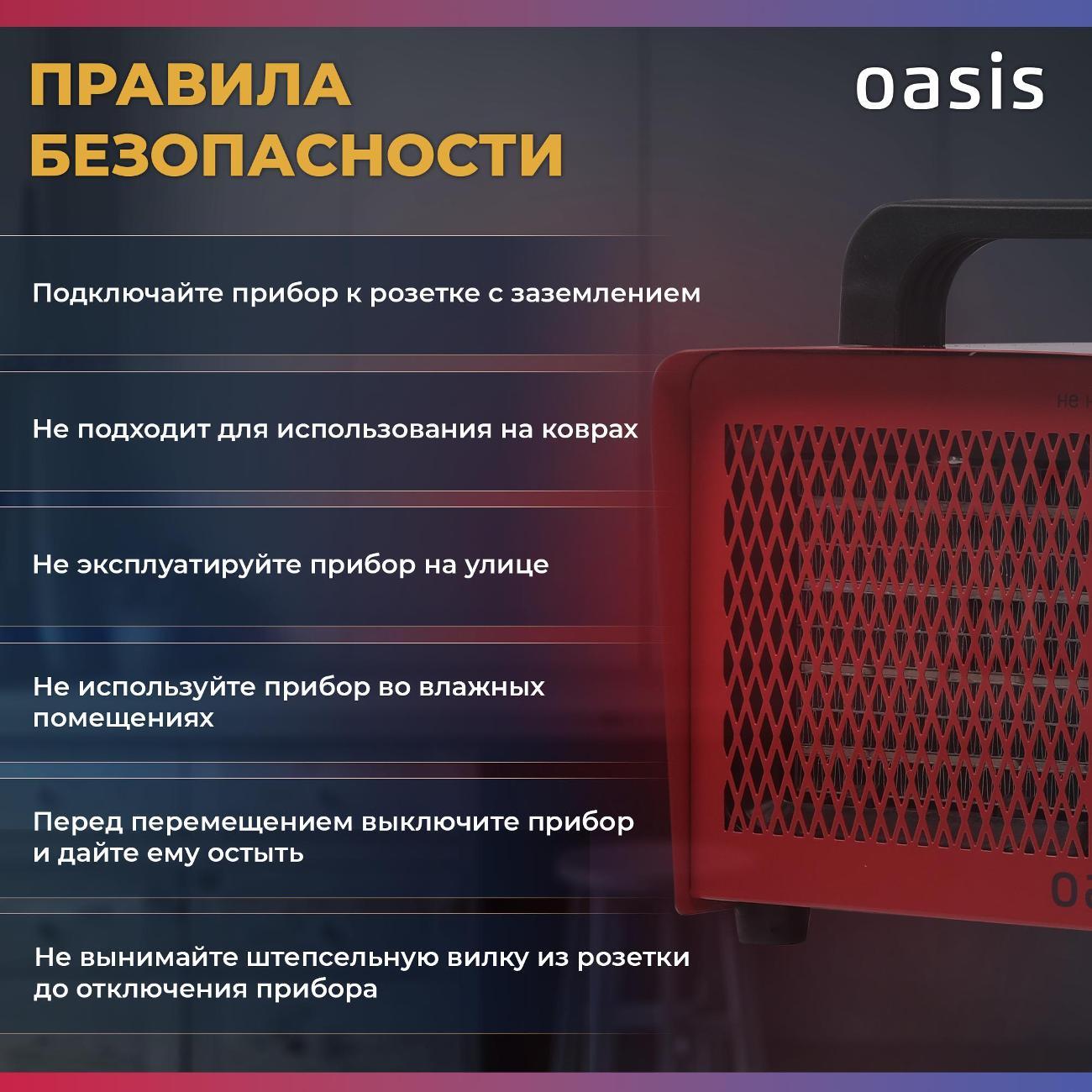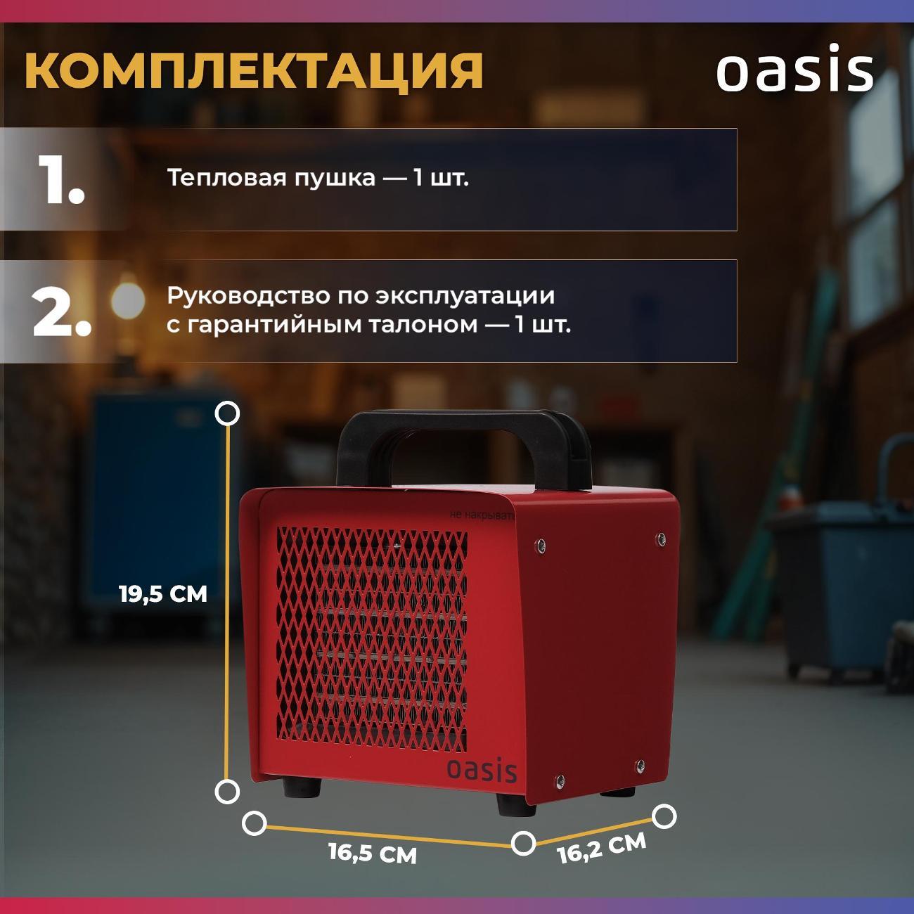 Тепловая пушка Oasis TPK-20 оборудована металлокерамическим нагревательным элементом, рассчитанным на обогрев площади до 20 м². Устройство можно считать бесшумным, поскольку во время эксплуатации уровень шума не превышает 35 дБ. В случае перегрева срабатывает автоотключение.
