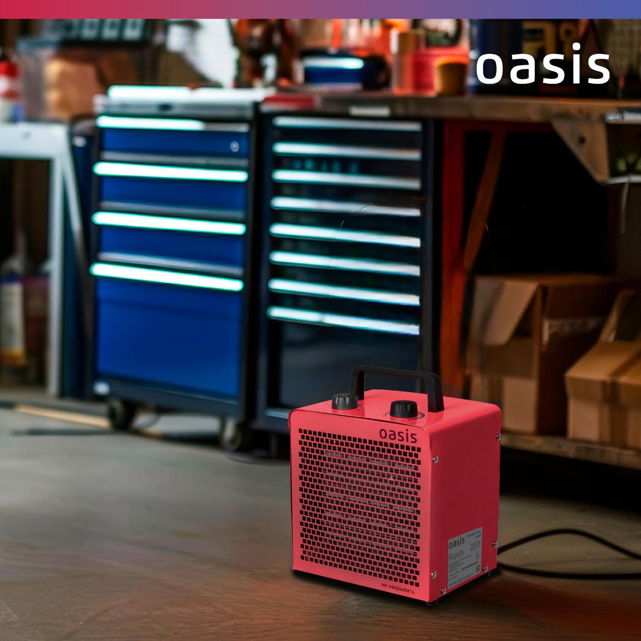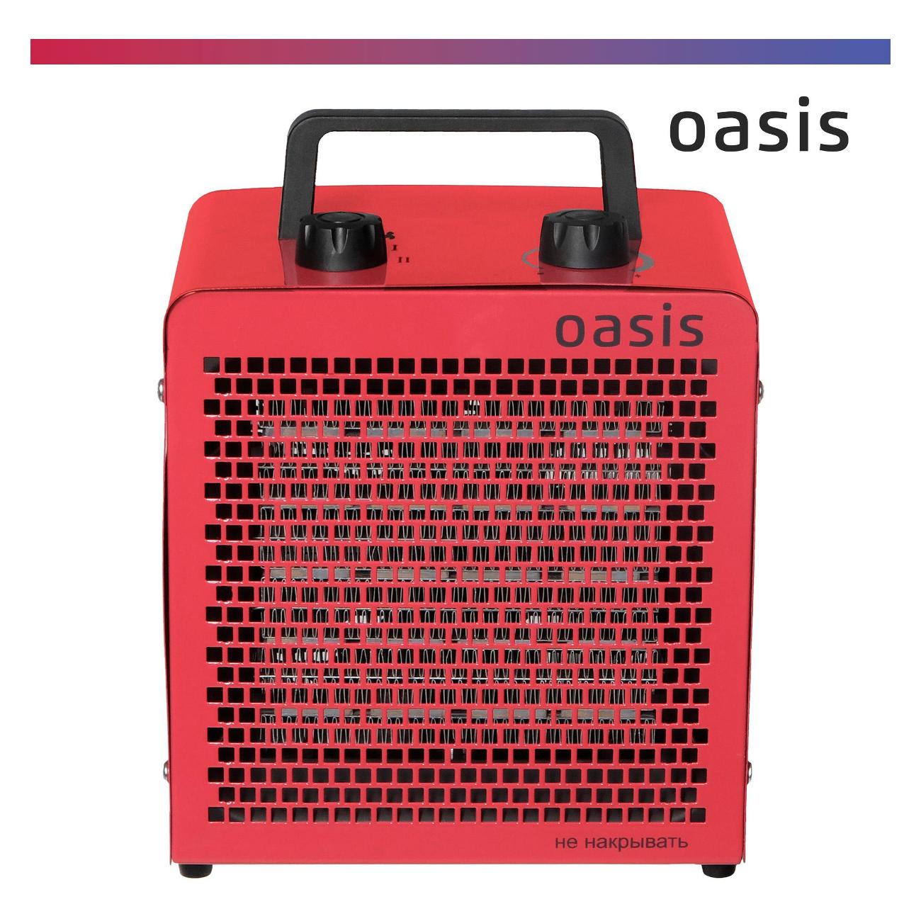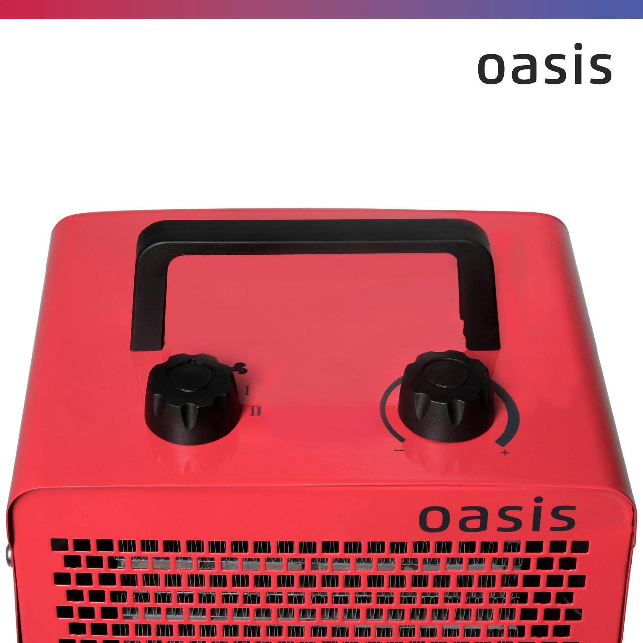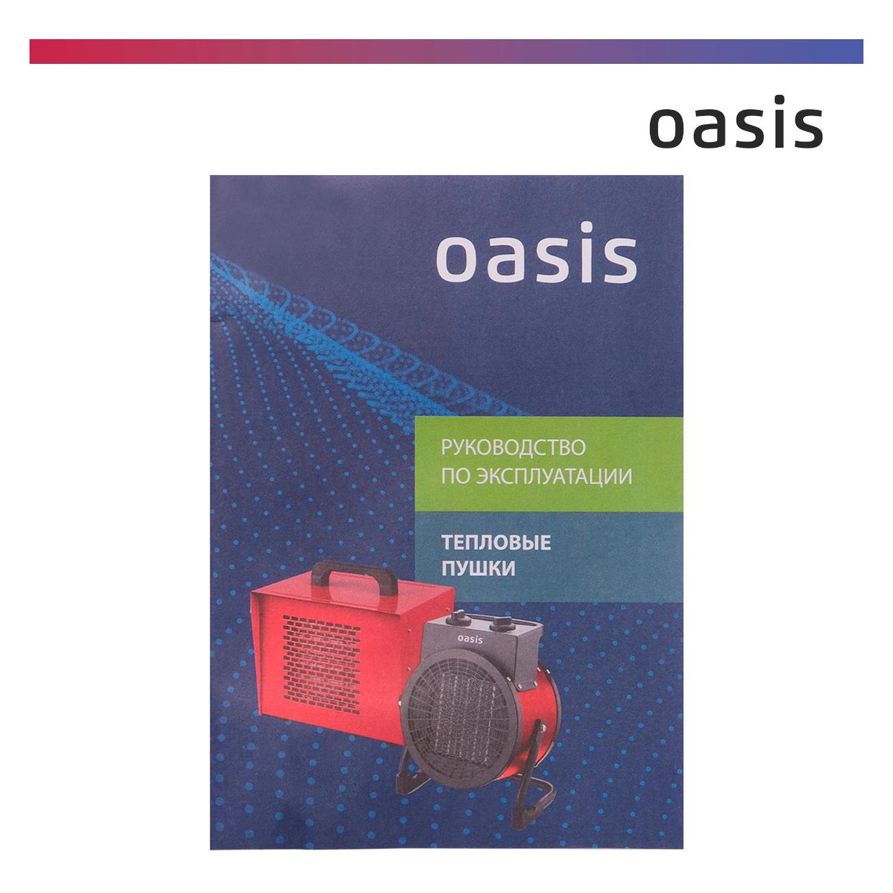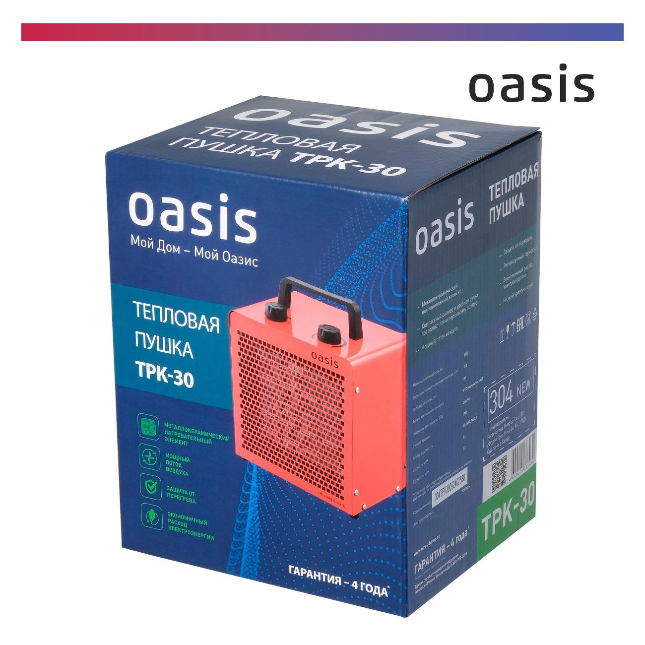 Тепловая пушка Oasis TPK-30 оборудована металлокерамическим нагревательным элементом, рассчитанным на обогрев площади до 30 м². Уровень шума во время эксплуатации устройства не превышает 52 дБ. В случае перегрева срабатывает автоотключение.