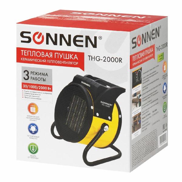 Электрическая тепловая пушка Sonnen 456193 — портативный воздухонагреватель максимальной мощностью 3 кВт, предназначенный для эксплуатации в жилых и хозяйственных помещениях площадью до 30 м². Устройство работает от керамического нагревательного элемента, защищенного от перегрева и способного мгновенно согревать нагнетаемый вентилятором воздух до высокой температуры. Нагрев пространства идет с первых минут работы благодаря формированию воздушного потока 210 м³/ч. Показатели шума во время работы Sonnen 456192 не превышают 40 дБ.