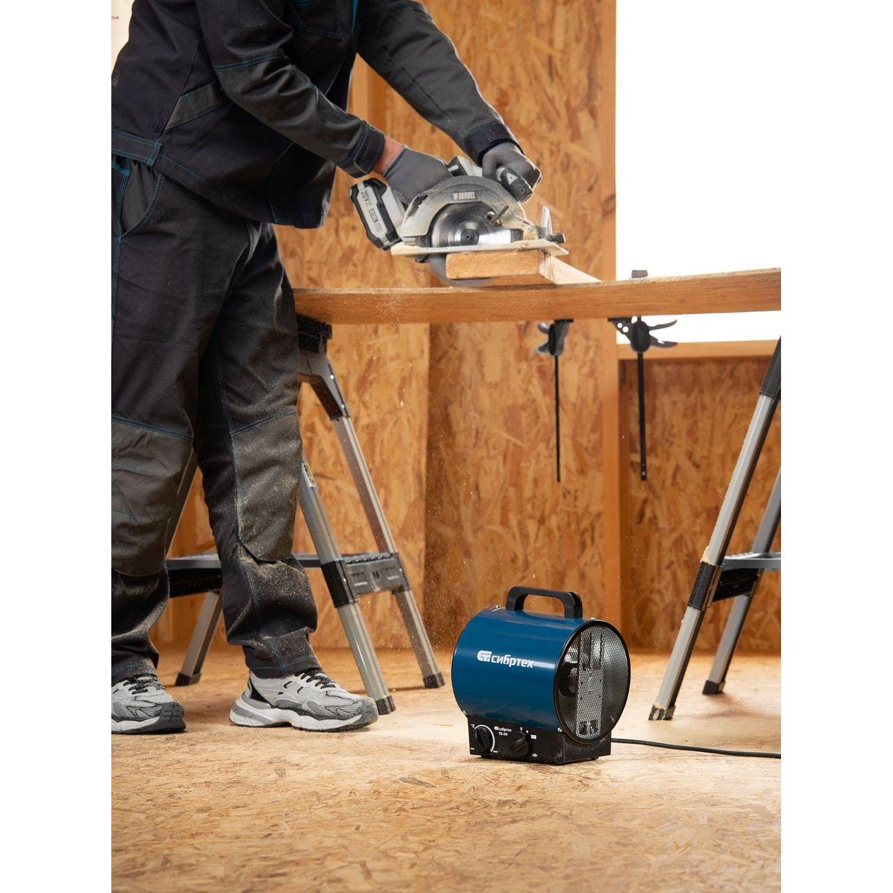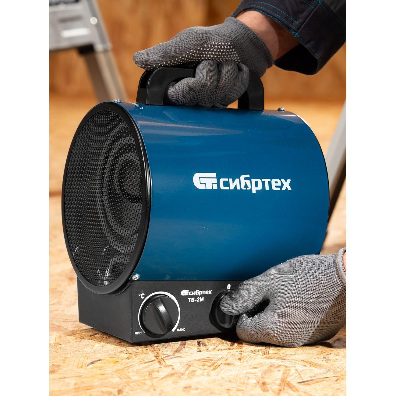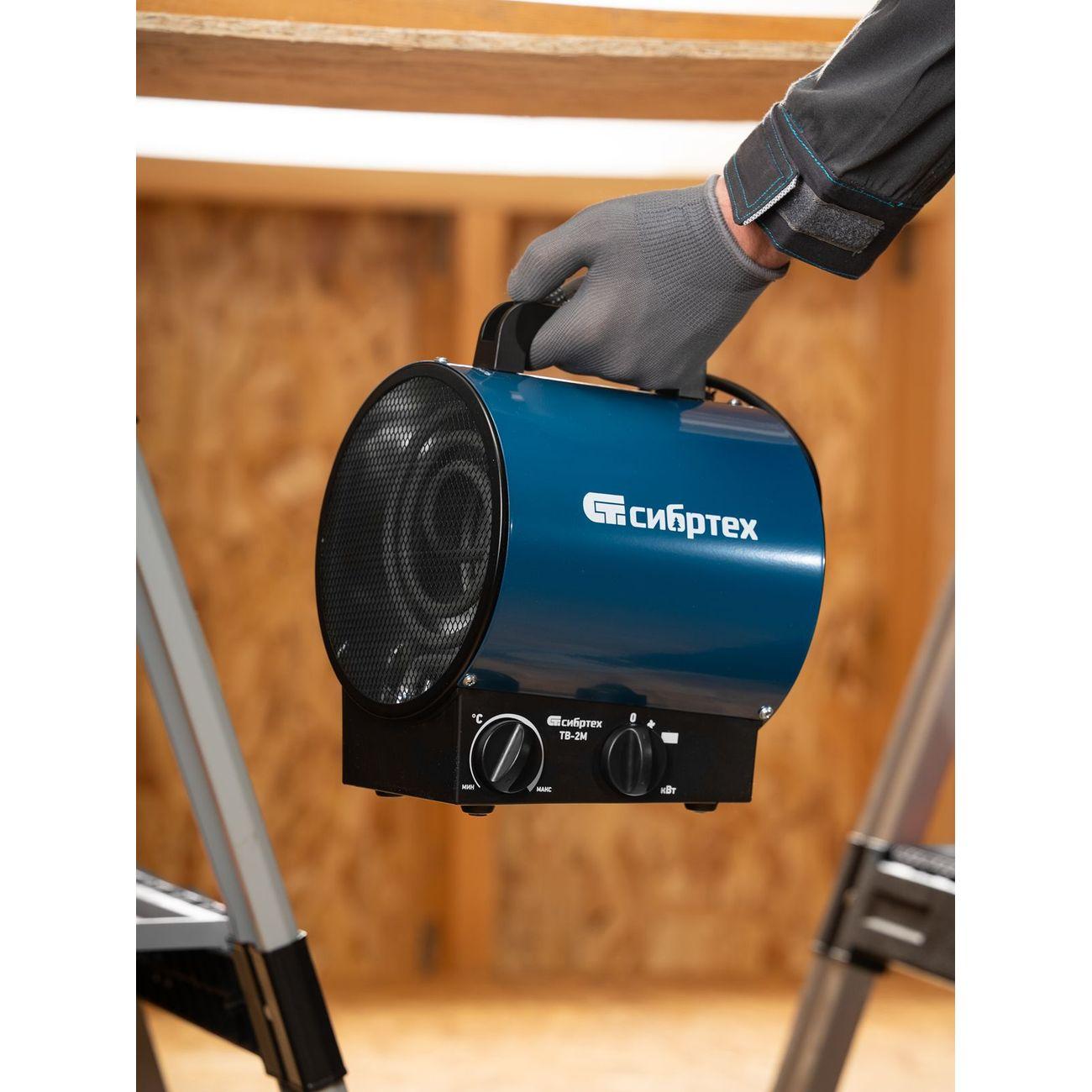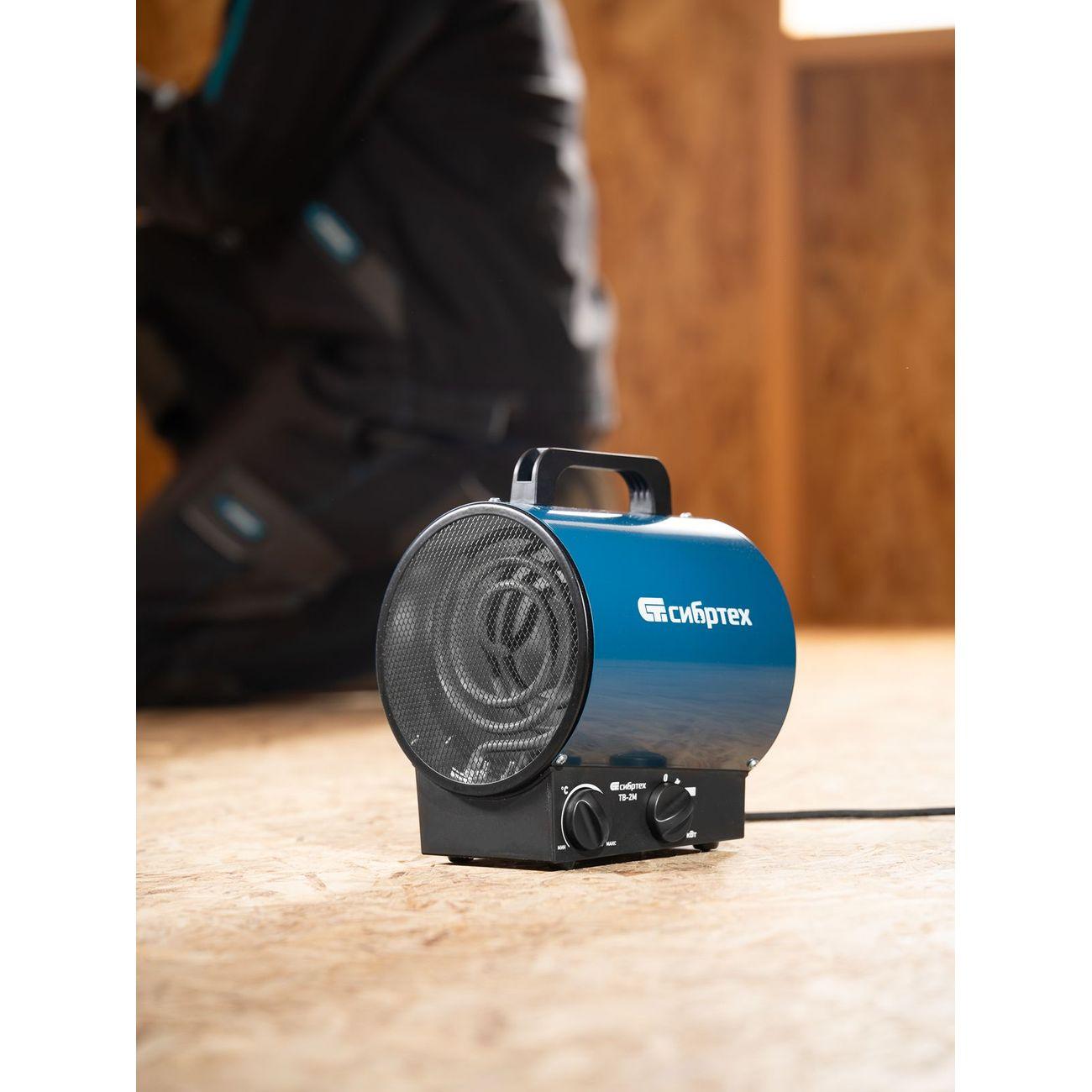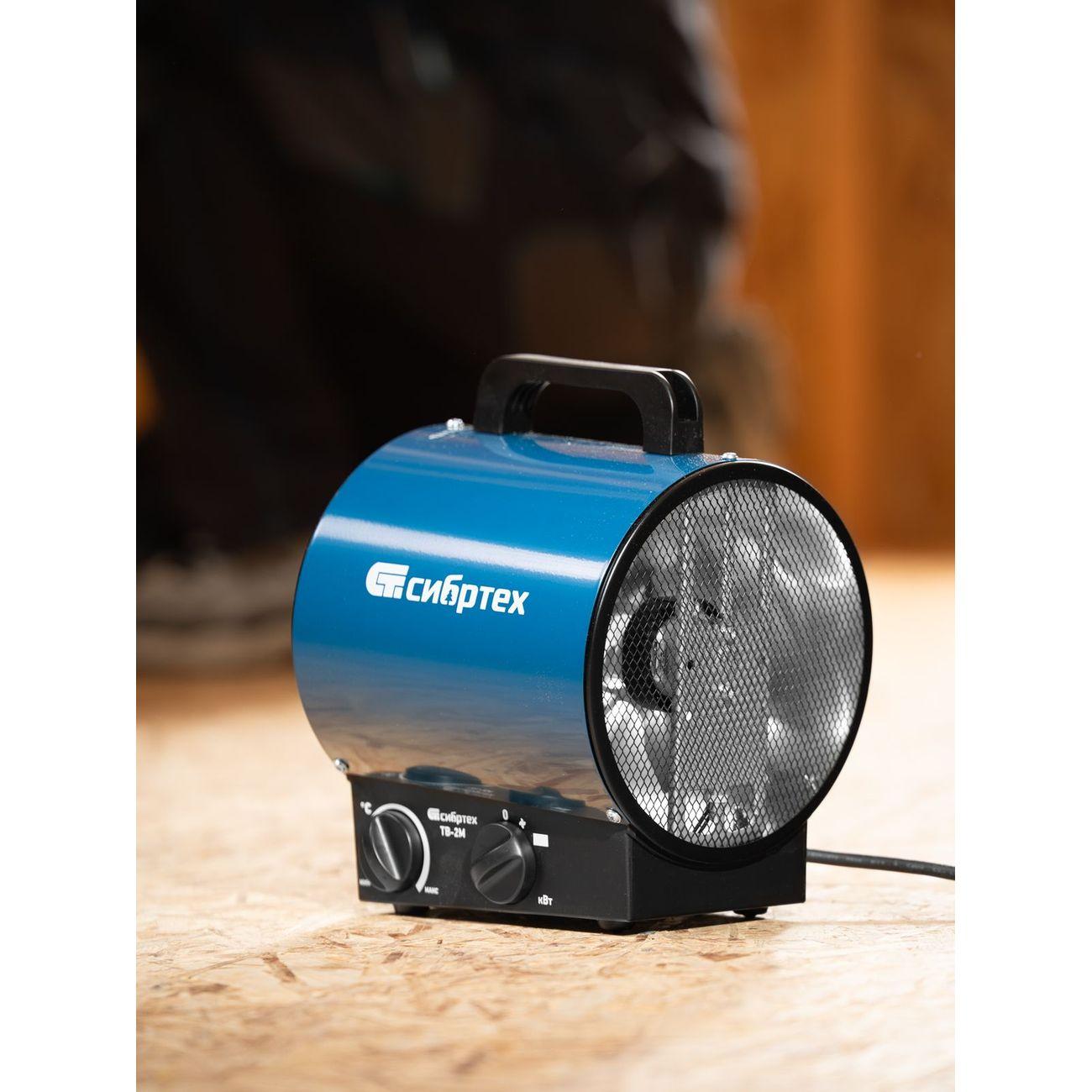Тепловентилятор «Сибртех» ТВ-2М обладает мощностью 2 кВт, поэтому характеризуется высокой производительностью. Рекомендованная площадь обогрева — до 20 кв. м. Круглый ТЭН обеспечивает эффективный теплообмен и равномерный нагрев комнаты, характеризуется пониженной пожароопасностью и уменьшенным сгоранием пыли. Благодаря этому устройство подходит для обогрева помещений с длительным пребыванием людей. Активация, выбор подходящего режима работы и температуры осуществляются с помощью механических переключателей.