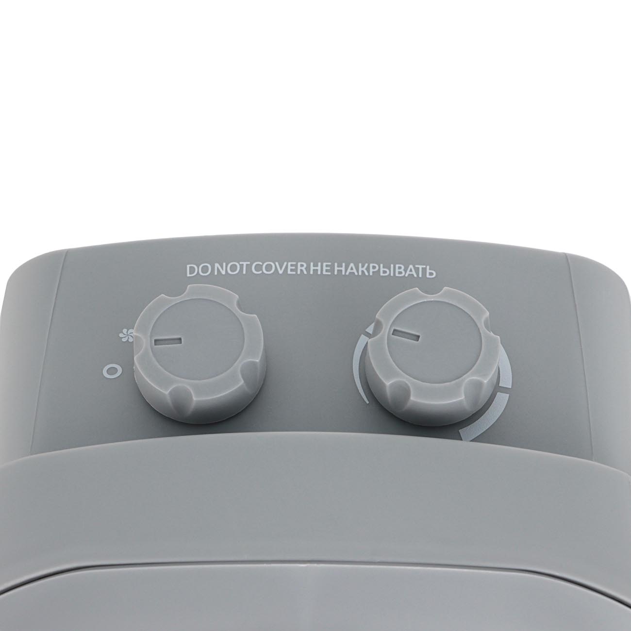 Прибор оснащён эффективным спиральным нагревательным элементом и надёжным и очень простым в использовании механическим управлением: поворотными регуляторами, расположенными в верхней части корпуса. Один отвечает за выбор уровня мощности (1000 или 2000 Вт), второй – за установку температуры нагрева, термостат точно её контролирует. Эта модель не будет простаивать и в тёплое время года, ведь её можно применять и как обычный вентилятор, для чего есть соответствующий режим.