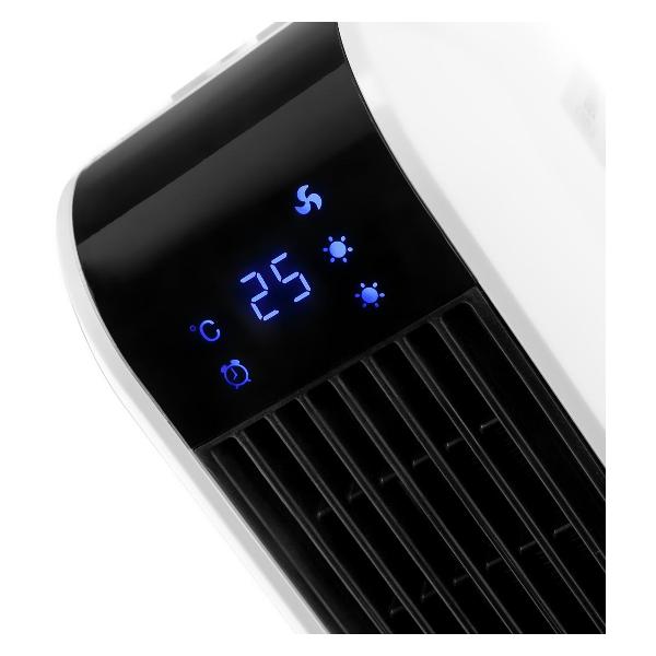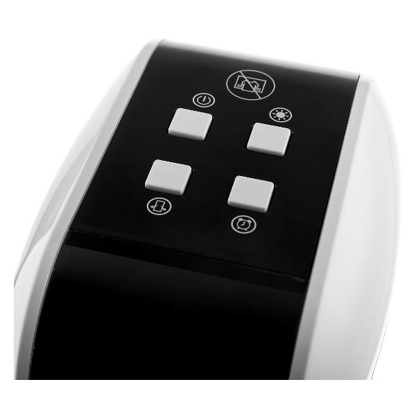 Модель оснащена тремя режимами работы. Удобство настройки параметров достигается за счет инфракрасного пульта ДУ, который входит в набор поставки. Основание дополнено прорезиненными ножками, препятствующими опрокидыванию. Решетка защищает внутренние элементы от попадания пуха и крупного мусора. Материал изготовления — пластик черного цвета. Вес — 2,67 кг.