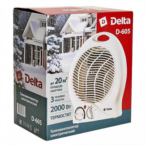 Тепловентилятор Delta D-605 белого цвета обладает габаритами 27х14х23,5 см и массой 1,05 кг. Длина встроенного сетевого кабеля — 1 м. На лицевой стороне размещаются индикаторы режима работы и включения. Устройство оснащается системой отключения при перегреве. В приборе установлен нагревательный элемент типа спираль. Корпус и решетка изготавливаются из пластика.