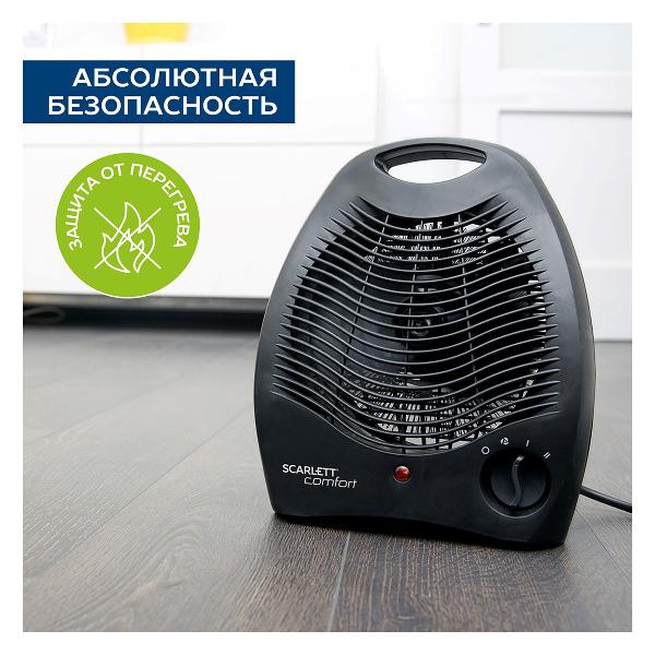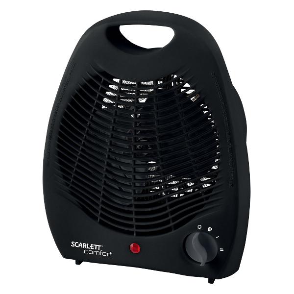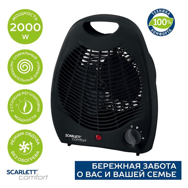 Тепловентилятор Scarlett SC-FH212S заключен в пластиковый корпус черного цвета с поворотным основанием. Внутри находится спиральный нагревательный элемент, а на передней панели — механическое управление и индикация.