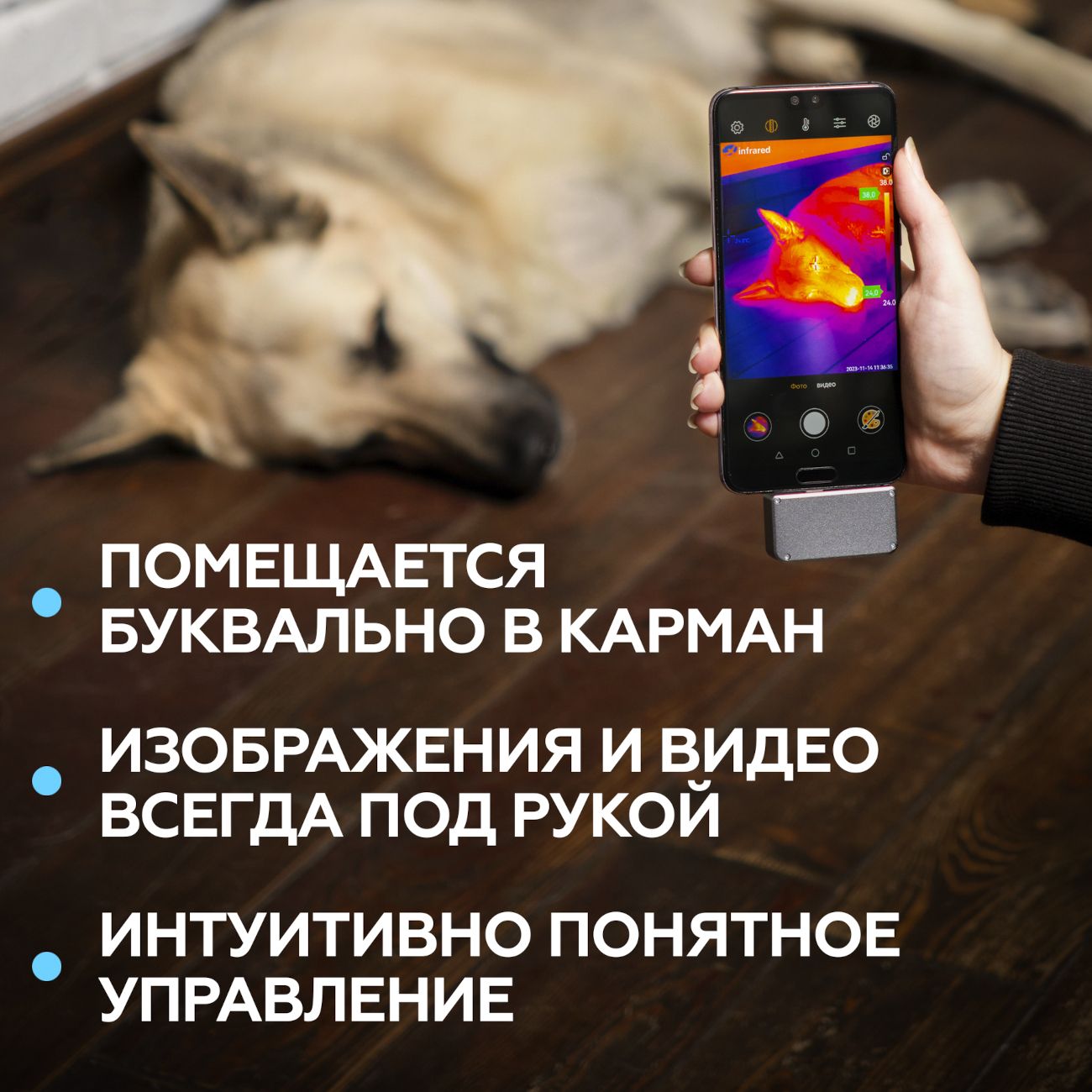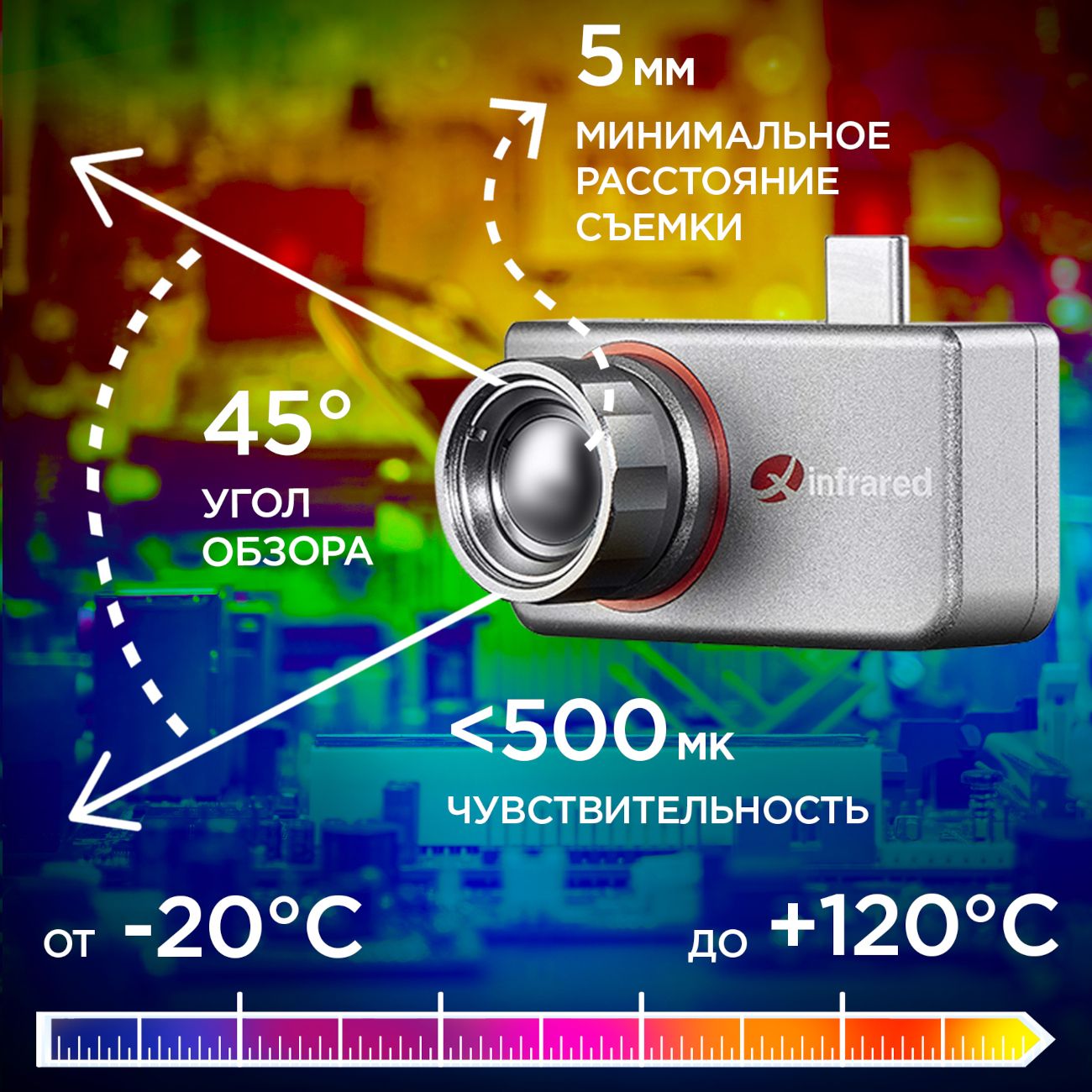 Серый тепловизор для смартфона Infiray T3S с русским интерфейсом производит фото и видеосъемку в высоком разрешении с частотой 25 кадр/сек. Устройство поддерживает ОС Android. Ручная фокусировка возможна на расстоянии 0.0050-550 м. Угол обзора равен 45°. Высокая тепловая чувствительность составляет 500 мК. Измерения производятся на дальности 3200 м в диапазоне -10/50 (погрешность 2°).