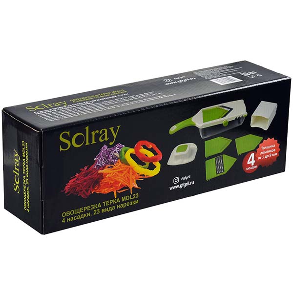 Тёрка Solray MDL23 – незаменимый кухонный помощник. С ней вы натрёте и нашинкуете продукты так, как вам надо, потратив на это совсем немного времени. Продуманная конструкция позволяет легко и безопасно менять аксессуары, а прорезиненные ножки обеспечивают безупречную устойчивость во время использования.