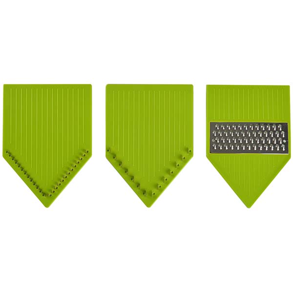 В комплекте есть четыре сменных насадки. Лезвие-нож пригодится, чтобы порезать овощи, фрукты и сыр ломтиками, причём их толщину можно регулировать. Остальные аксессуары необходимы, чтобы создать стружку или крошку нужного размера для салатов, супов и других блюд либо для украшения выпечки.