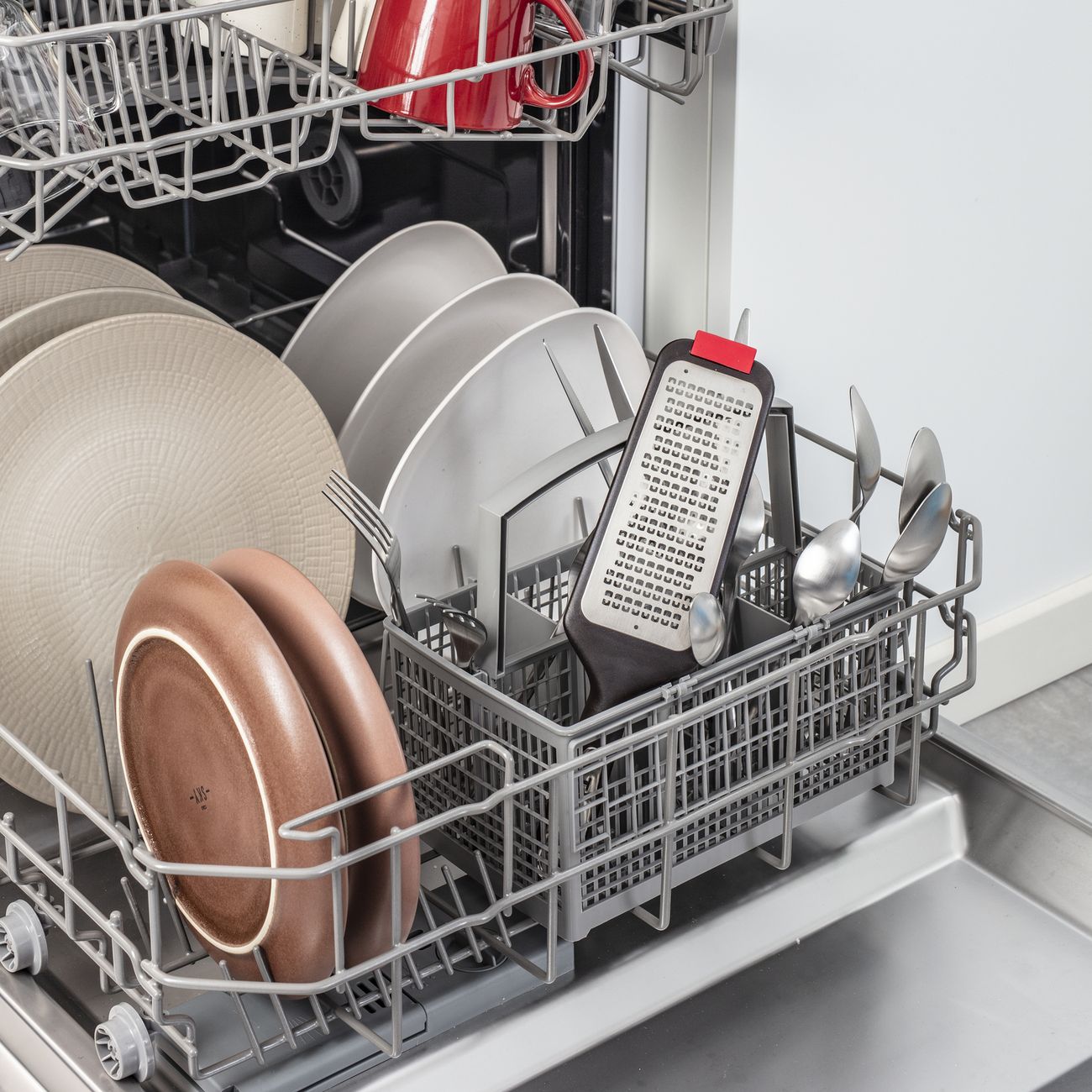 Мягкая пластиковая ручка тёрки надёжно лежит в ладони и не скользит даже в мокрых пальцах. Рабочая часть выполнена из нержавеющей стали, которая не боится коррозии и не темнеет со временем от контакта с водой и растительными кислотами. Кроме того, этот материал хорошо держит заточку, поэтому аксессуар будет эффективно измельчать продукты даже длительное время при постоянном использовании. Для удобства и безопасности обращения в основании тёрки есть специальный упор, который не даёт ей скользить по столешнице, тарелке или разделочной доске.