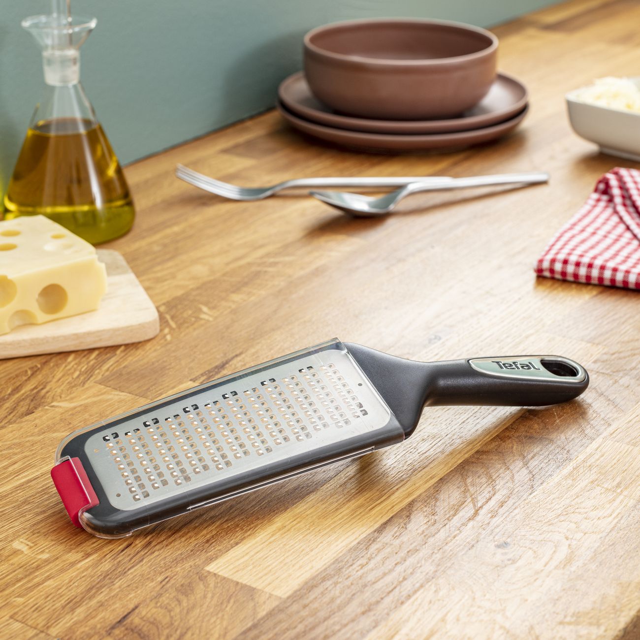 Ручная тёрка Tefal Ingenio K2070714 — компактный кухонный аксессуар, предназначенный для измельчения и шинкования овощей и фруктов. Хранить изделие можно не только в кухонном ящике: на ручке есть специальное отверстие для подвешивания на крючок рейлинга.