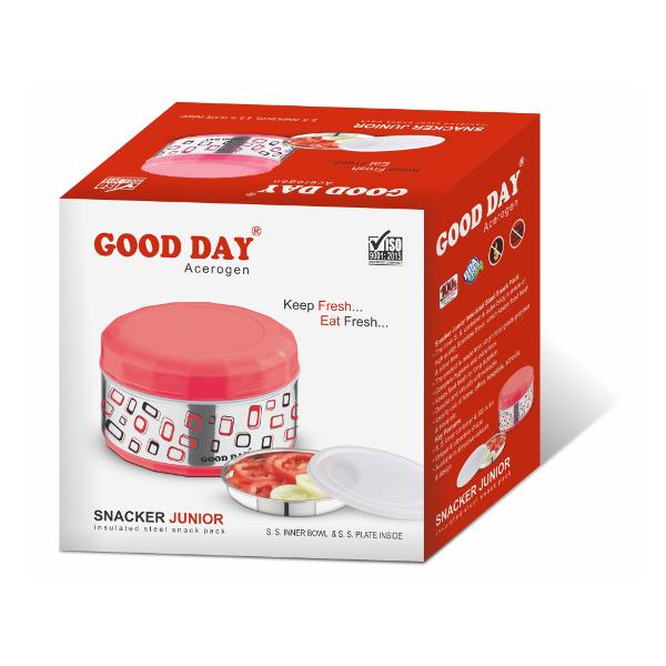 Термо ланч-бокс Good Day Snacker Junior GL32539RD оснащен герметично закрывающейся крышкой. Модель подходит для хранения горячих и холодных продуктов объемом до 0,39 л. Колба из нержавеющей стали сохраняет температуру в течение 4 часов.