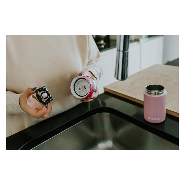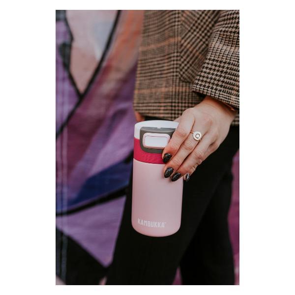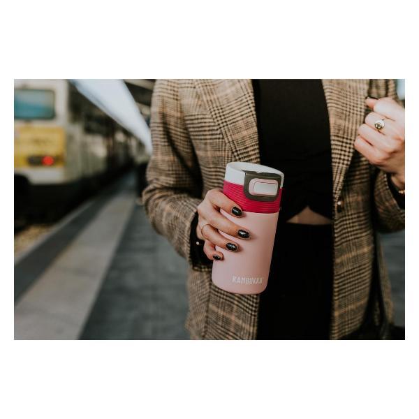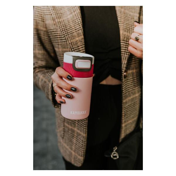 Термокружка Kambukka 11-01039 способна поддерживать температуру горячих напитков на протяжении 5 часов. Время сохранения холода достигает 11 часов. Корпус модели выполнен из стали, устойчивой к образованию коррозии и различным механическим повреждениям. Внешние стенки стакана не нагреваются. Объем составляет 300 мл. Снимающаяся крышка гарантирует 100% герметичность термокружки. Доступно три положения клапана-задвижки: «Открыто», «Нажать для глотка» и «Закрыто». Нижняя часть корпуса прорезинена, что обеспечивает надежную фиксацию стакана на любой поверхности.