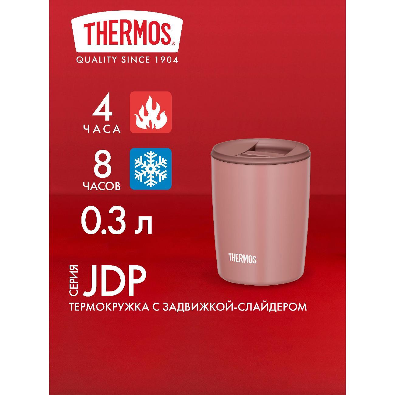 Стильная термокружка Thermos JDP-301MBW 0.3L пудрового цвета — компактный аксессуар габаритами 10,5х7х7 см и весом 180 г, который сохранит температуру напитка в течение нескольких часов.
