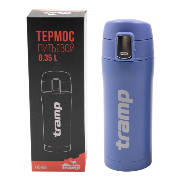 Термос Tramp TRC-106 объемом 350 мл выполнен из ударопрочной нержавеющей стали. Горячий напиток остынет до температуры 60° через 6 часов, до 45° — через 12. Диаметр горлышка — 5,3 см. Крышка Flip Top снабжена фиксатором и открывается одной рукой, под ней расположен поильник. Термос весит 270 г.