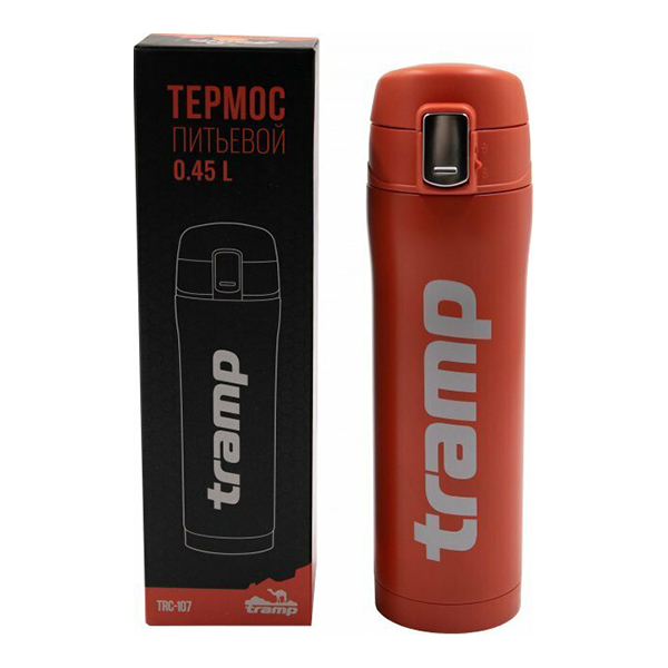 Термос Tramp TRC-107 объемом 450 мл выполнен из ударопрочной нержавеющей стали. Горячий напиток остынет до температуры 60° через 6 часов, до 45° — через 12. Диаметр горлышка — 5,3 см. Крышка Flip Top снабжена фиксатором и открывается одной рукой, под ней расположен поильник. Термос весит 306 г.