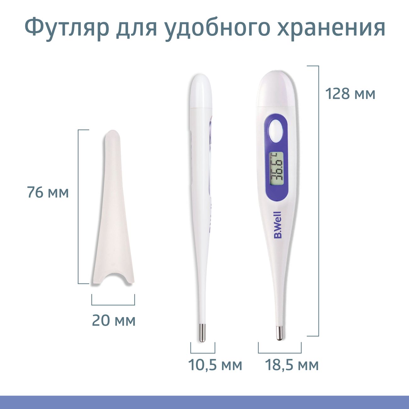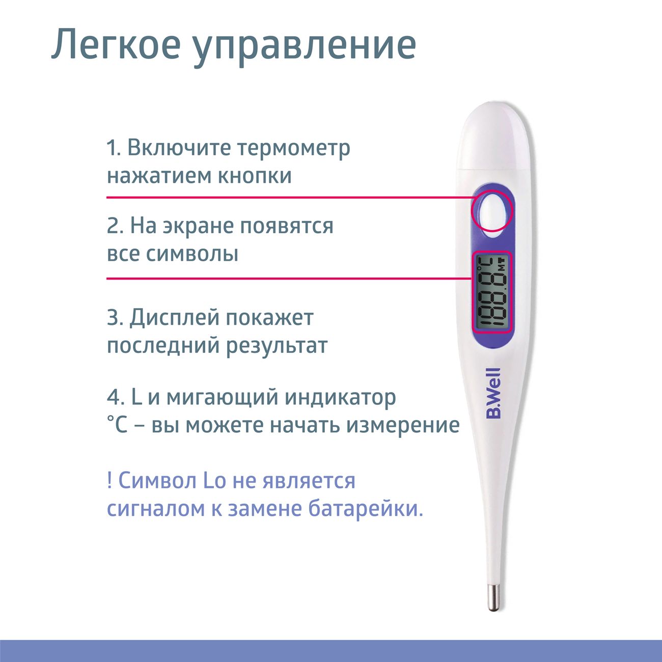 Термометр B.Well WT-03 – это простой и безопасный прибор, который позволит вам всего за одну минуту измерить температуру тела. При этом вам не понадобится засекать время: ровно через 60 секунд прозвучит звуковой сигнал, оповещающий о том, что градусник пора вытащить.