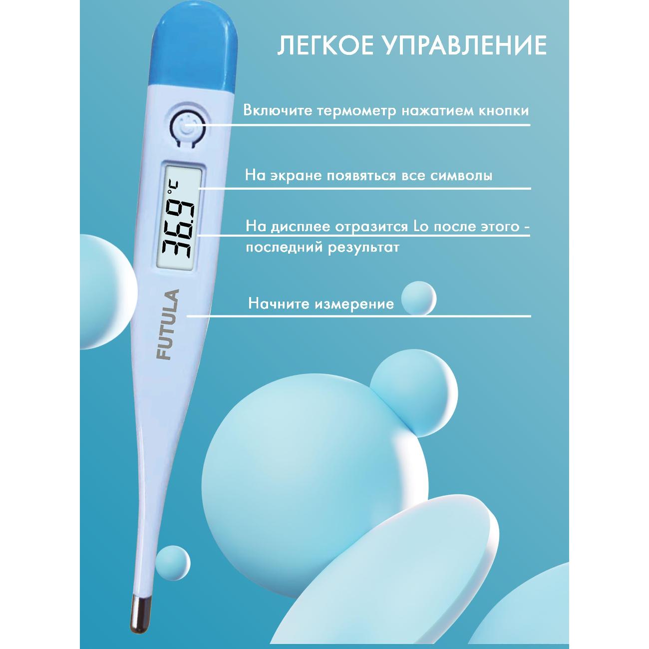 Цифровой термометр Futula DT2 белого цвета отключается автоматически через 10 минут после окончания измерений. Корпус сделан из прочного гигиеничного пластика. Габариты модели — 1,5х13х2 см. Результат в °C или °F выводится на дисплей через 30 секунд. Об окончании процесса сообщает троекратный звуковой сигнал. Последнее измерение сохраняется в памяти. Диапазон измерений — от 32°C до 42,9°C. Погрешность составляет 0,1°C. Прибор безопасен для использования, не содержит ртуть. Устройство подходит для ректального, орального или подмышечного определения температуры.
