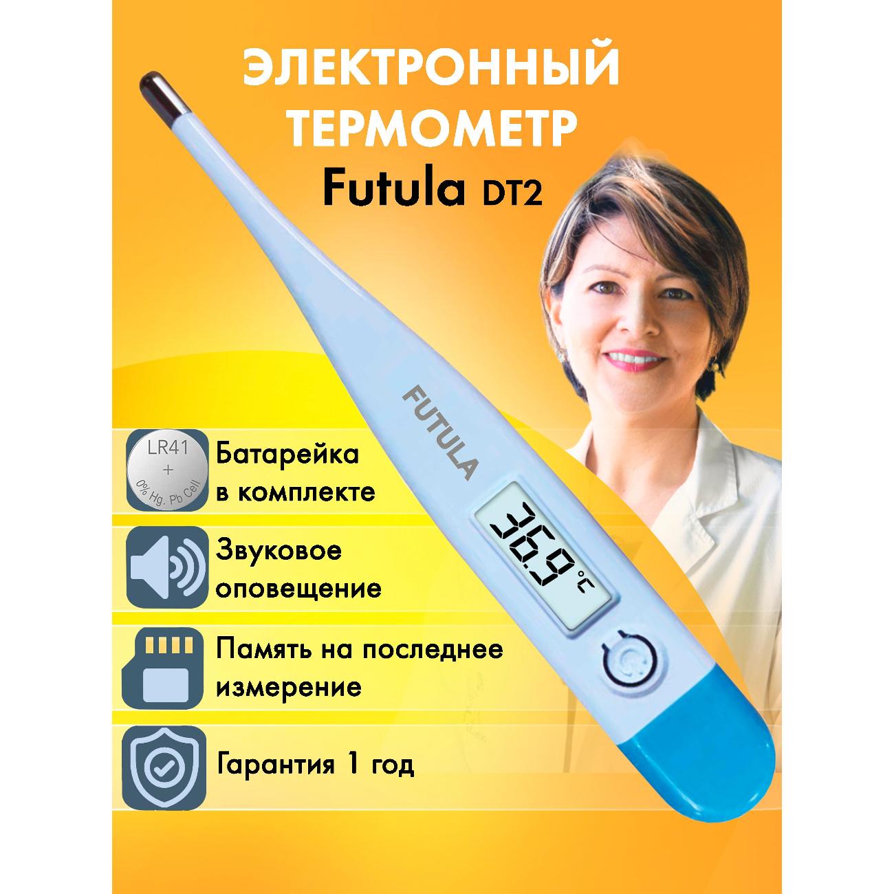 Термометр цифровой Futula DT2 производит замер температуры тела в пределах от 32°С до 42,9°С. Устройство предназначено для ректального и подмышечного использования. Погрешность измерения составляет 0,1°С. Возможно измерение температуры тела в Фаренгейтах. Конструкция данной модели включает в себя цифровой дисплей с выводом температурного показателя. Автоматическое отключение устройства произойдет после 10 мин бездействия.