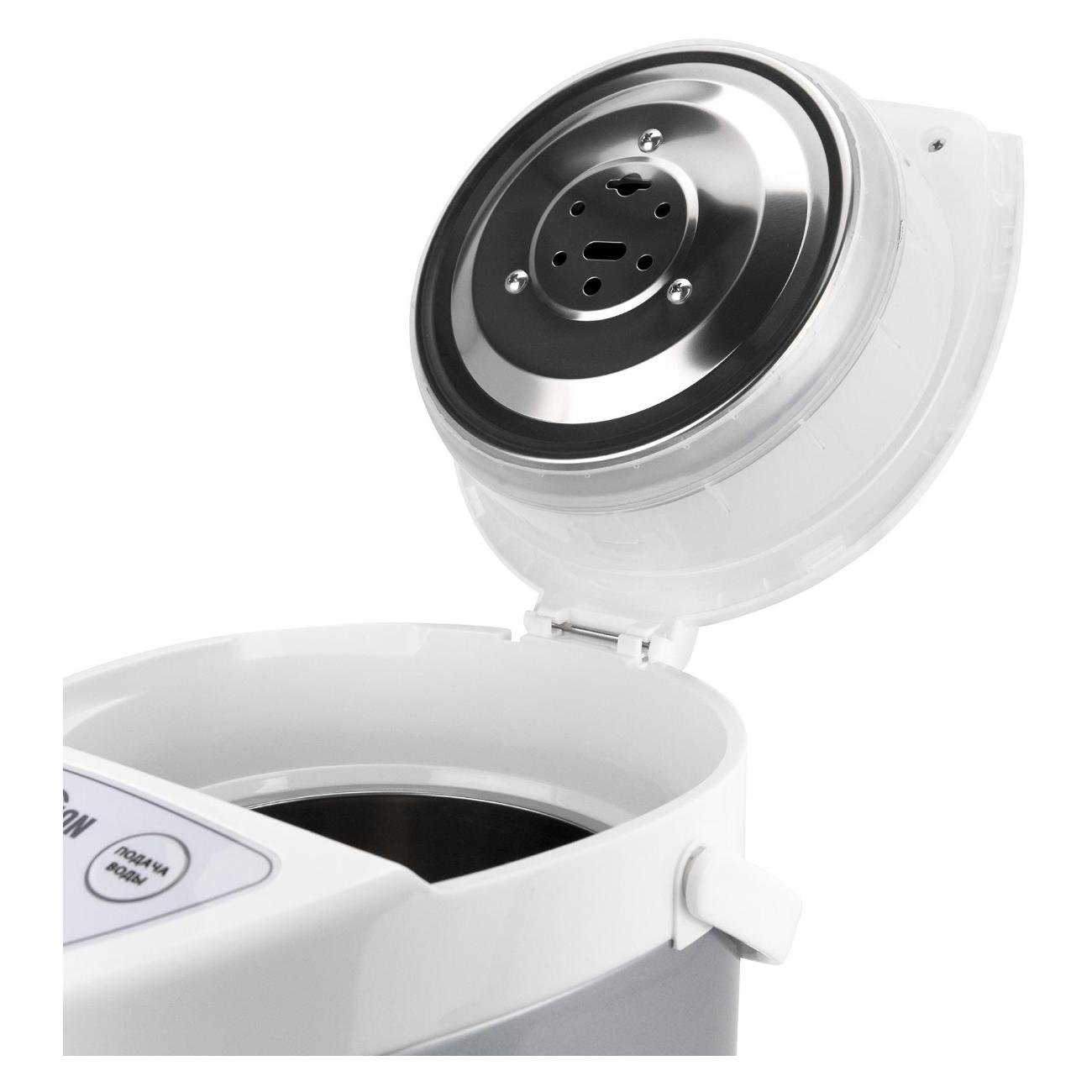 не проверила при заборе. штекер вдавлен,сам термопот как коробочка с сюрпризом. при кипячении вода разбрызгивается во все стороны, полоска у окошка с водой отклеилась менее,чем через неделю. крышка хрупкая,каждый раз страшно,что отвалится. вода льётся еле-еле. в общем, выброшенные на ветер деньги