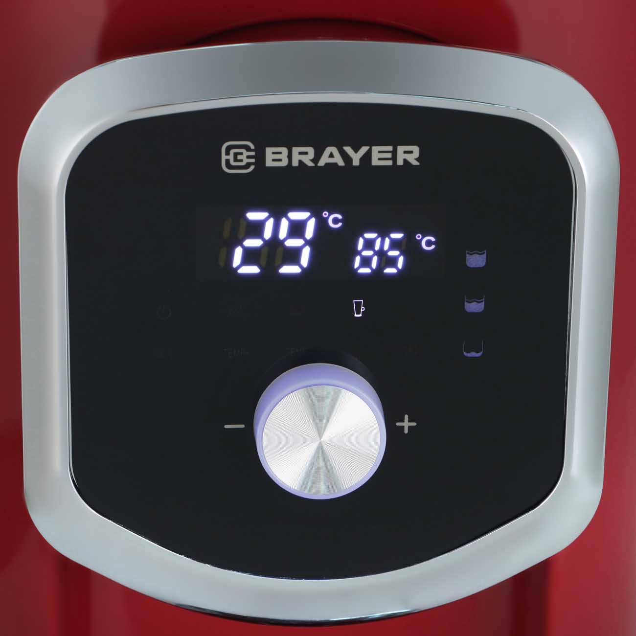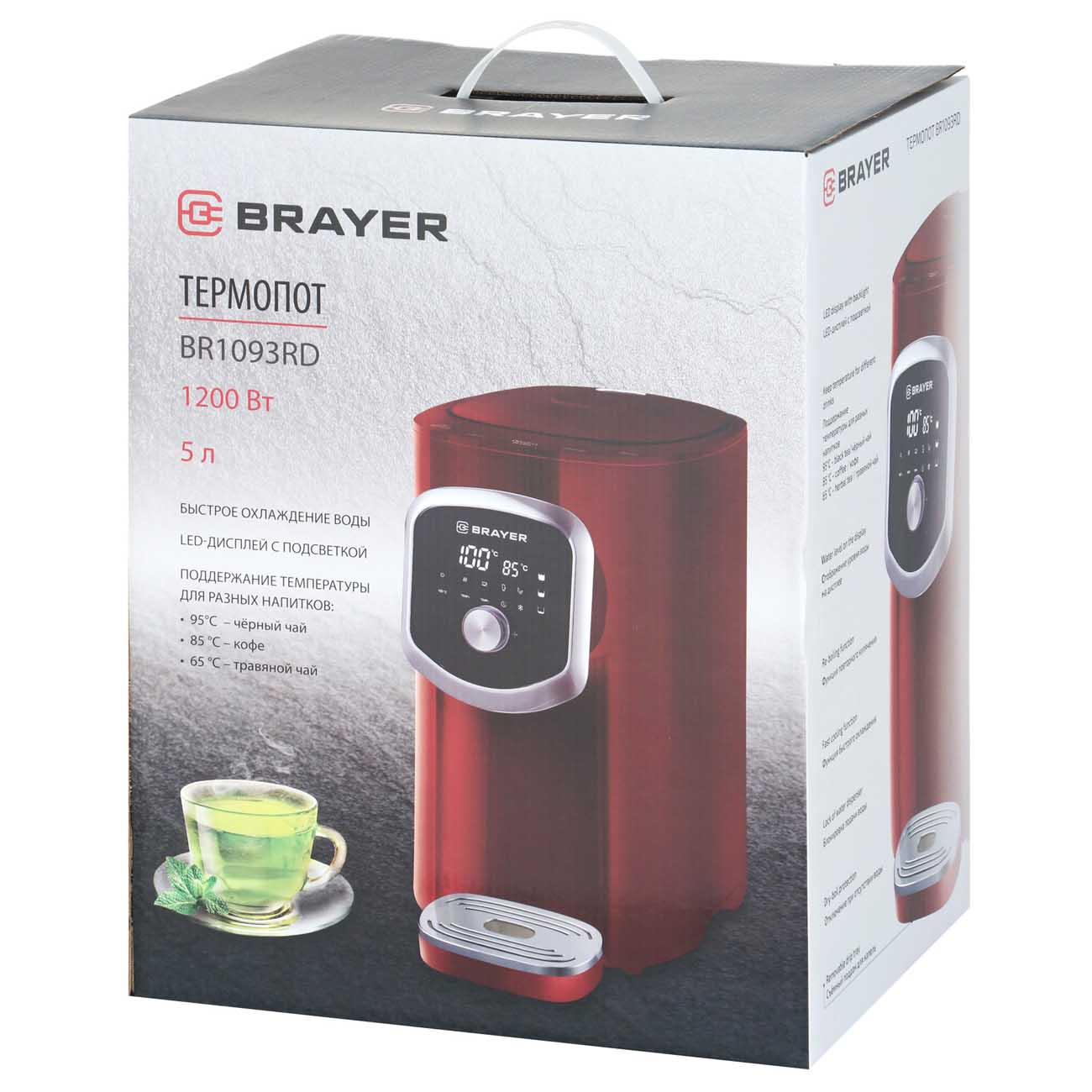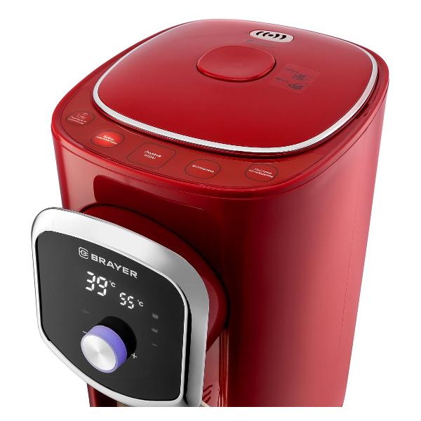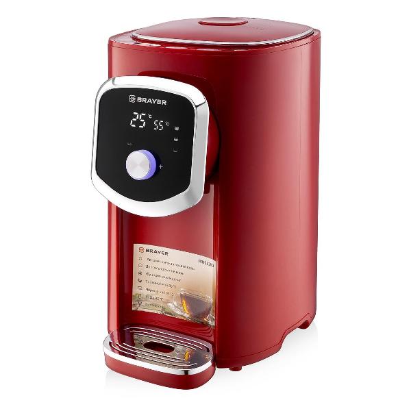 Термопот Brayer BR1093RD объемом 5 л выполнен из термостойкого пластика и металла красного глянцевого цвета. Корпус снабжен подсветкой, платформой для чашек с отсеком для сбора капель и механизмом автоматического розлива воды с помощью помпы.