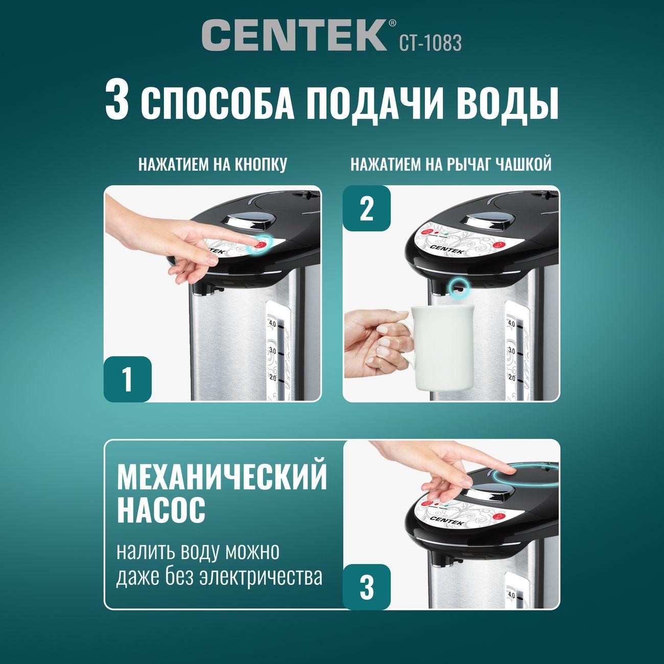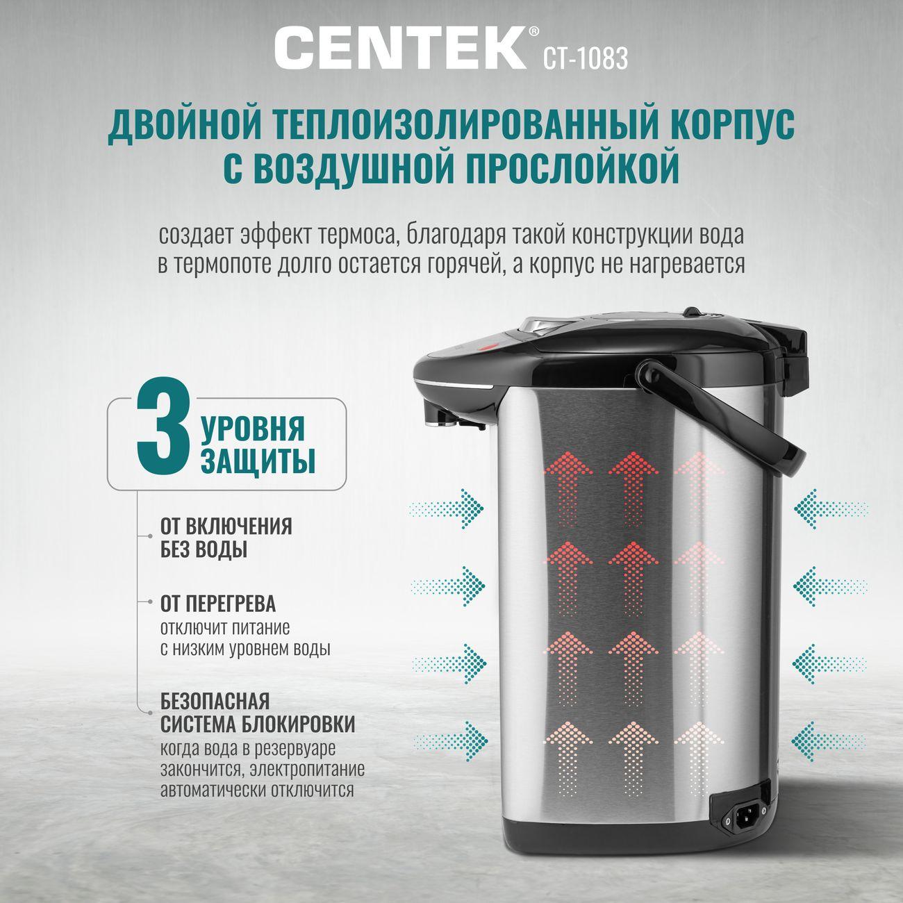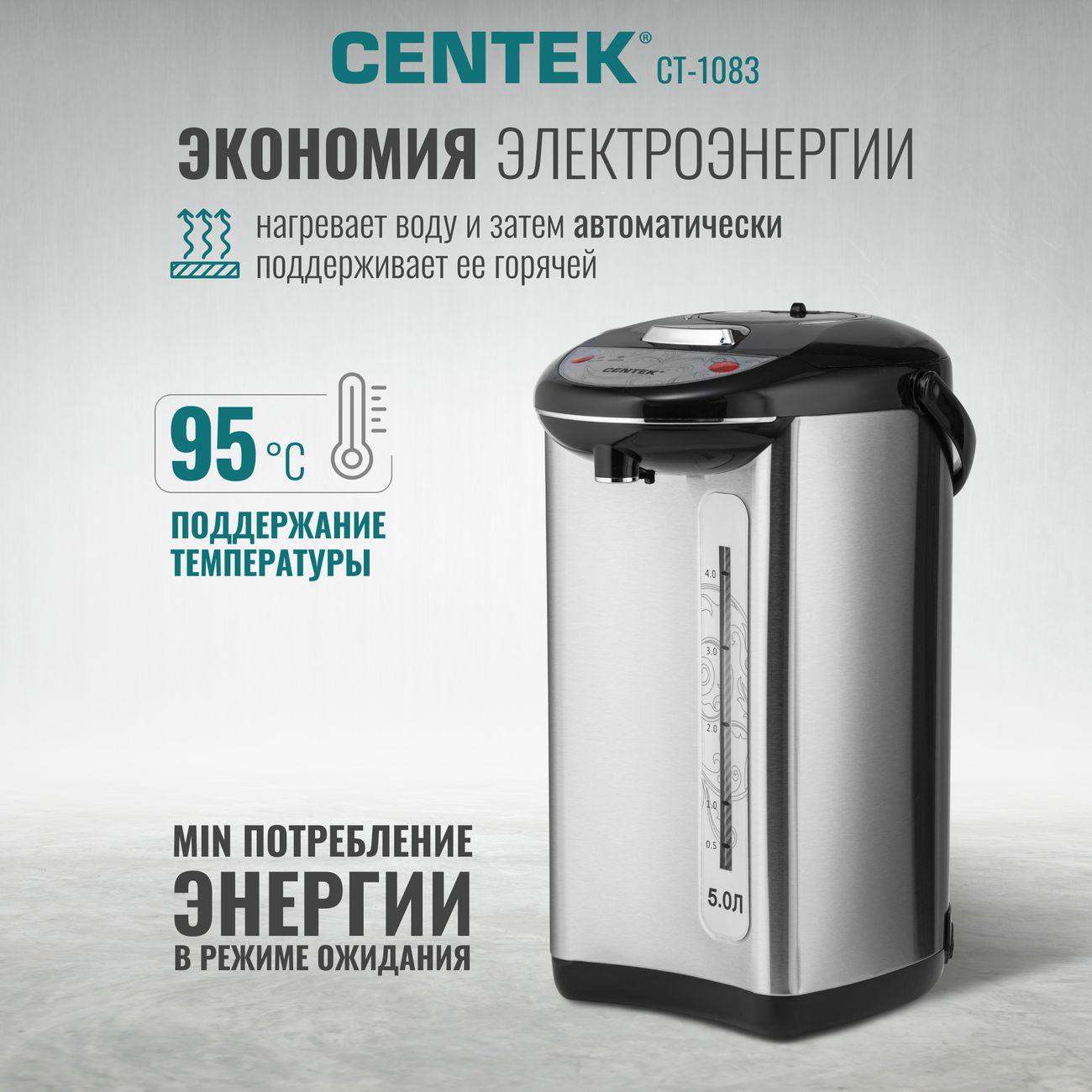 Вы можете купить Термопот Centek CT-1083 5л в магазинах М.Видео по доступной цене. Термопот Centek CT-1083 5л: подробное описание, фото и отзывы реальных покупателей, характеристики, возможность скачать инструкции и подобрать аксессуары.