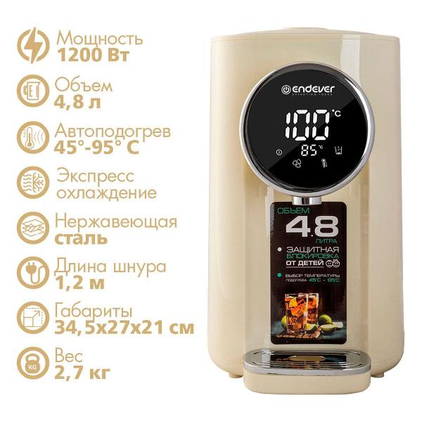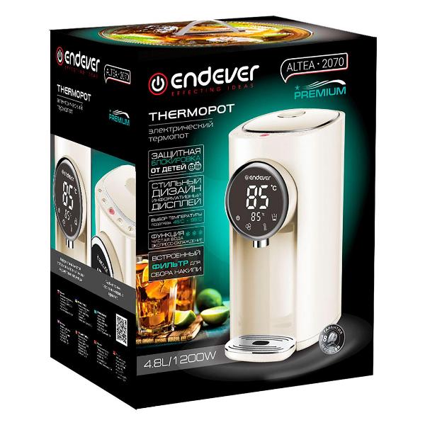 Термопот Endever Altea-2070 90332 мощностью 1200 Вт может быстро довести до кипения до 4,8 л воды. Корпус выполнен из металла и пластика. Длина сетевого шнура равна 1,2 м. Предусмотрено широкое горлышко для быстрого залива воды. Устройство может поддерживать температуру воды 55°С, 95°С, 45°С, 65°С. Возможно повторное кипячение и охлаждение содержимого.