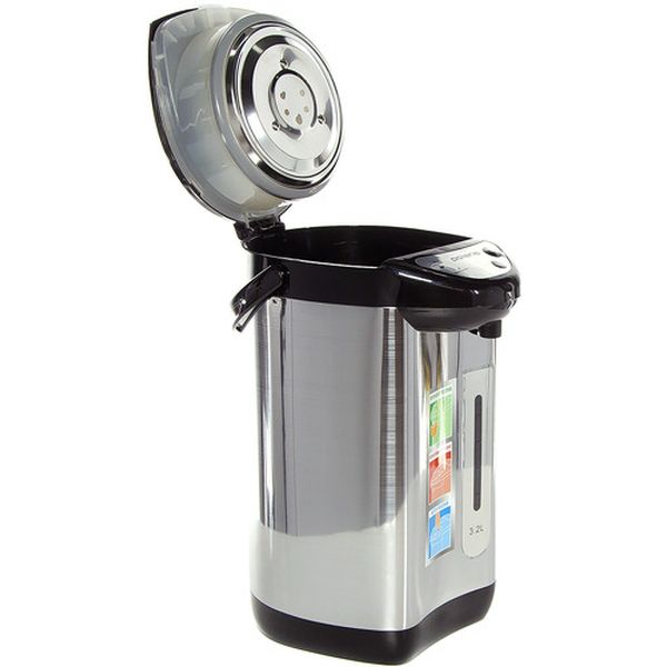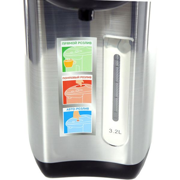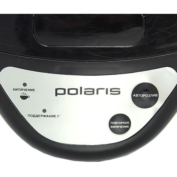 Термопот Polaris PWP 3215 вращается на 360°. Резервуар и корпус сделаны из нержавеющей стали. На передней части устройства расположена шкала уровня жидкости, оставшейся в баке. Колба вмещает до 3,2 л. Способы розлива — автоматический, ручной и помповый.