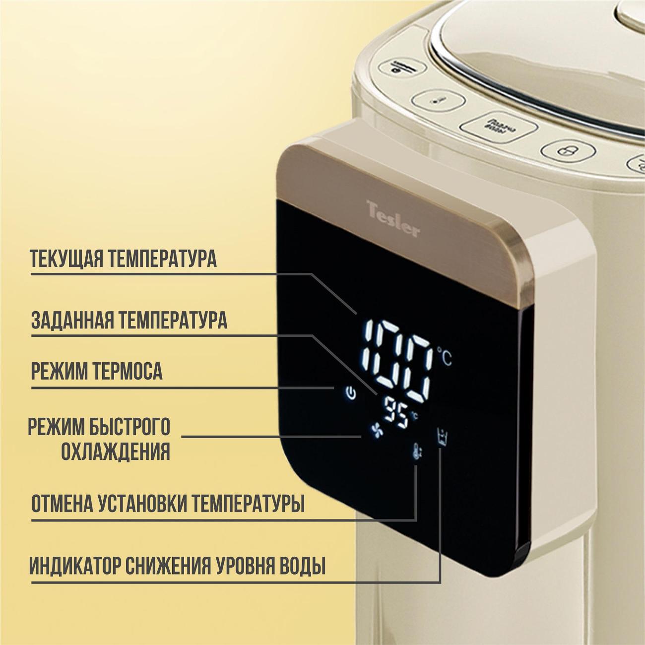 Термопот Tesler TP-5045 в бежевом пластиковом корпусе функционирует от сети и поддерживает нагрев до 100°С. Модель мощностью 1200 Вт получила защиту от детей и специальное покрытие внутренней колбы, препятствующее появлению накипи. На передней панели разместился LCD-дисплей, позволяющий узнать степень нагрева. Всего предусмотрено пять температурных режимов и функция повторного кипячения. Для удобства встроен индикатор уровня воды. Вес конструкции составляет 2,8 кг.