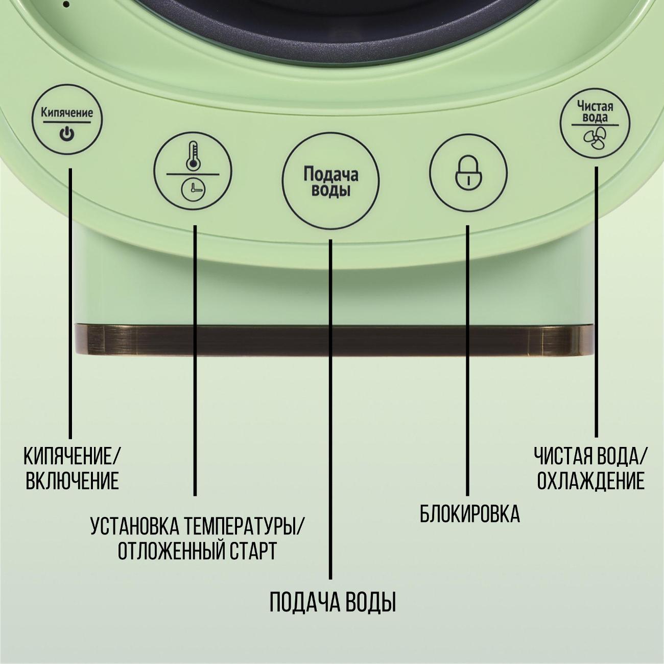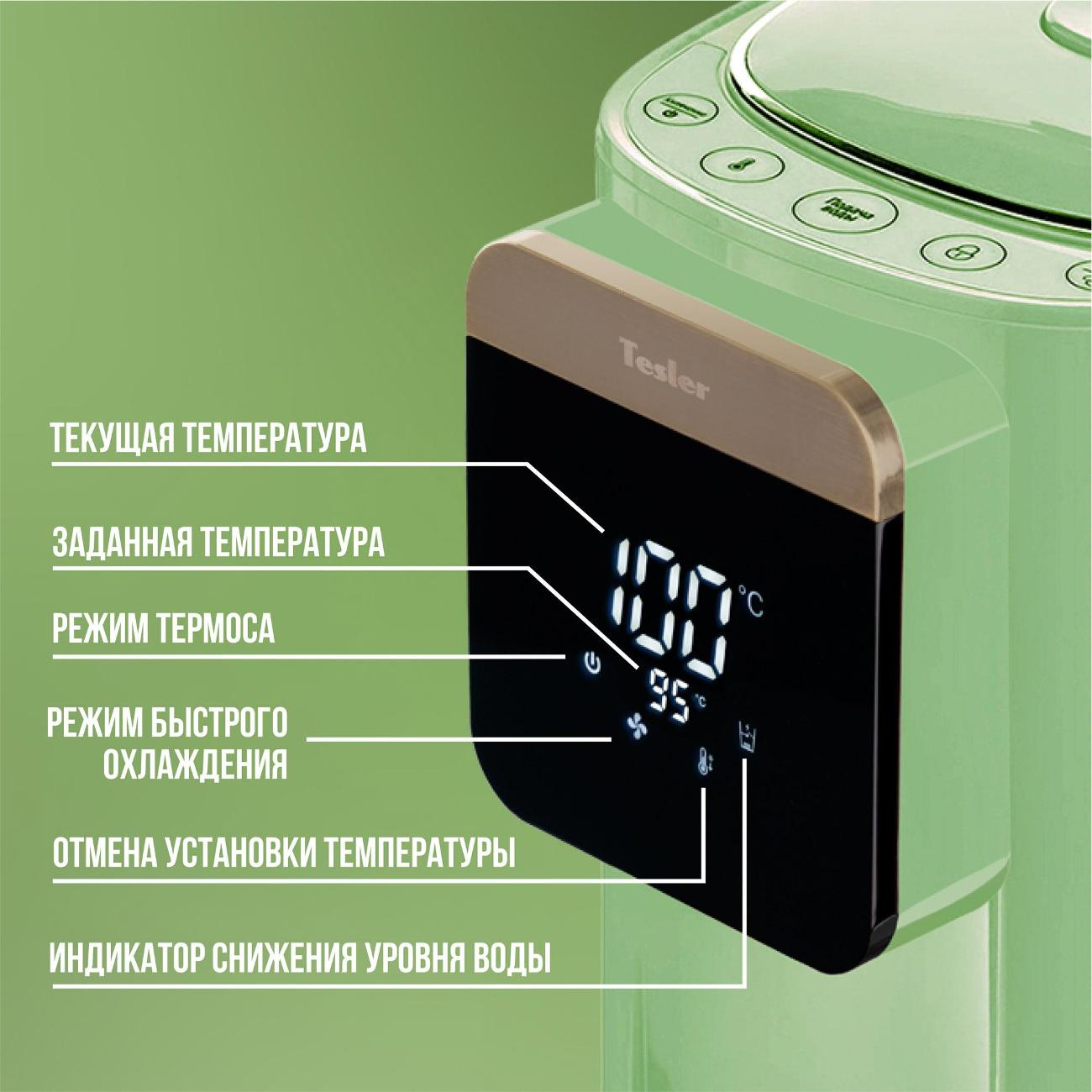 Термопот Tesler TP-5045, зеленый, с резервуаром объемом 5 л предназначен для кипячения воды и нагрева до одного из шести возможных значений (55°С, 95°С, 85°С, 45°С, 65°С). Устройство мощностью 1200 Вт поддерживает выбранную температуру. Изменять параметры можно с помощью сенсорной панели.
