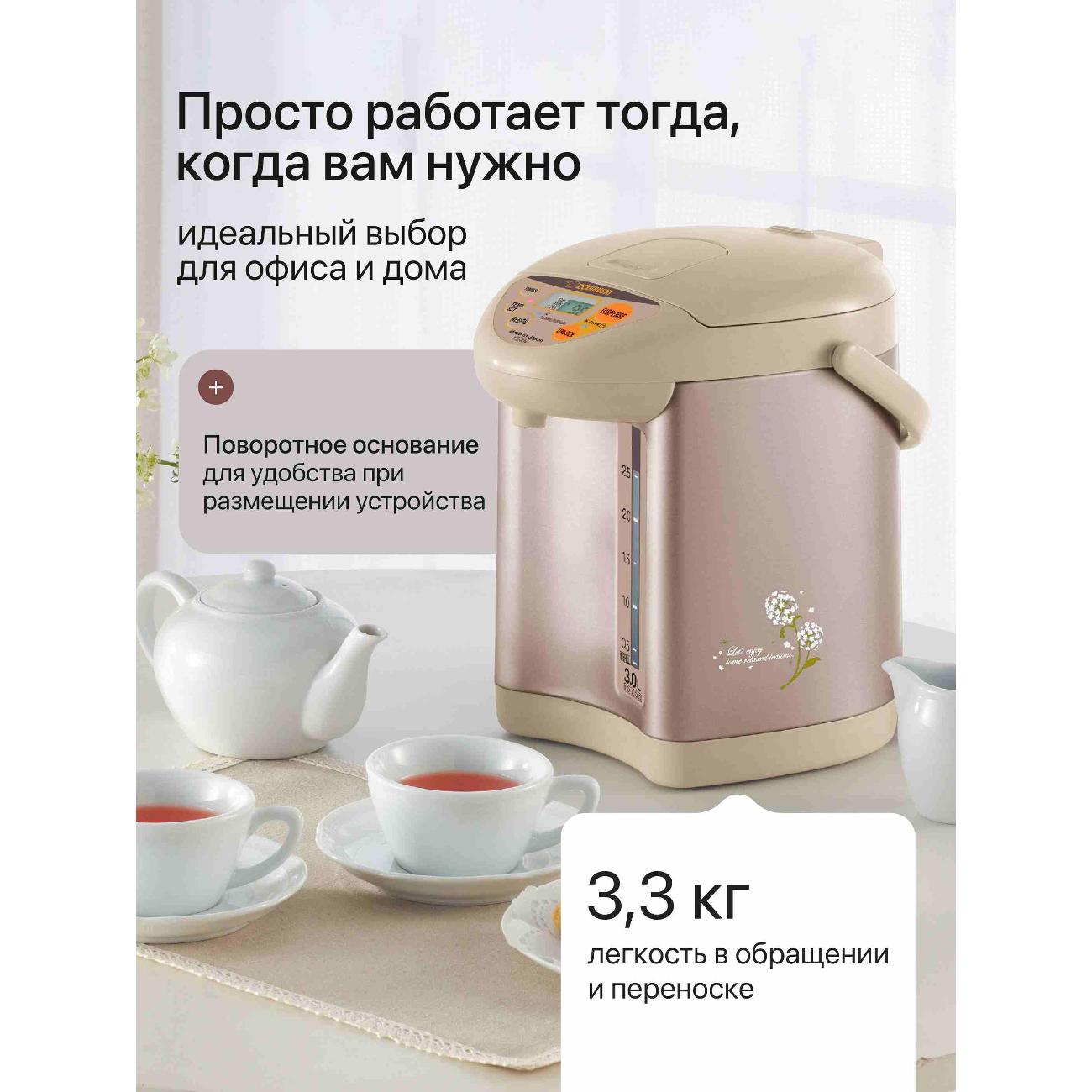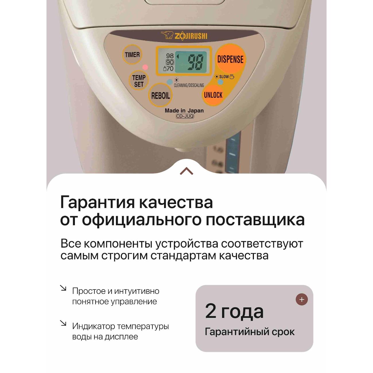 Термопот Zojirushi CD-JUQ30 обладает металлическим корпусом, стальным фильтром от образования накипи и электрическим насосом. На корпусе расположены индикаторы заданной температуры и уровня воды. Объем резервуара для воды составляет 3 л. Устройство способно нагревать воду до температуры от 70°С до 98°С. Среди функций данной модели — поддержание нужного температурного уровня жидкости, блокировка подачи воды, автоматическое отключение.