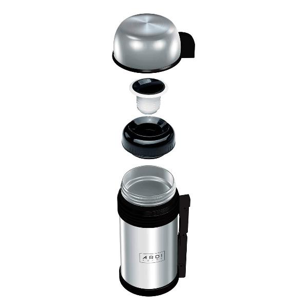 Термос Ardi Kuche TR13-1800 сохраняет холод и тепло продуктов в течение 16 часов. В стальную колбу помещается до 1,8 л. Горлышко обладает диаметром 11,5 см, упрощающим наливание жидкости или перекладывание блюд. Две пробки предотвращают проливание. Сбоку располагается складная ручка для переноски. Широкое основание обеспечивает устойчивость, препятствует переворачиванию.