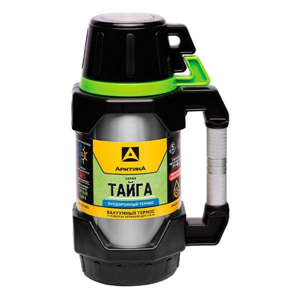 Термос «Арктика» 110-1500 выполнен в корпусе с высокопрочным покрытием. Показатели сохранения тепла улучшены — напиток останется горячим в течение 32 часов. Основной материал исполнения — нержавеющая сталь высокого качества. Сбоку находится усиленная алюминиевая ручка. Крышка хорошо прилегает к горлышку термоса и обеспечивает абсолютную герметичность. Напиток наливается в чашку без проливания. Вместе с термосом поставляются две чашки и контейнер. Объем модели составляет 1,5 л.