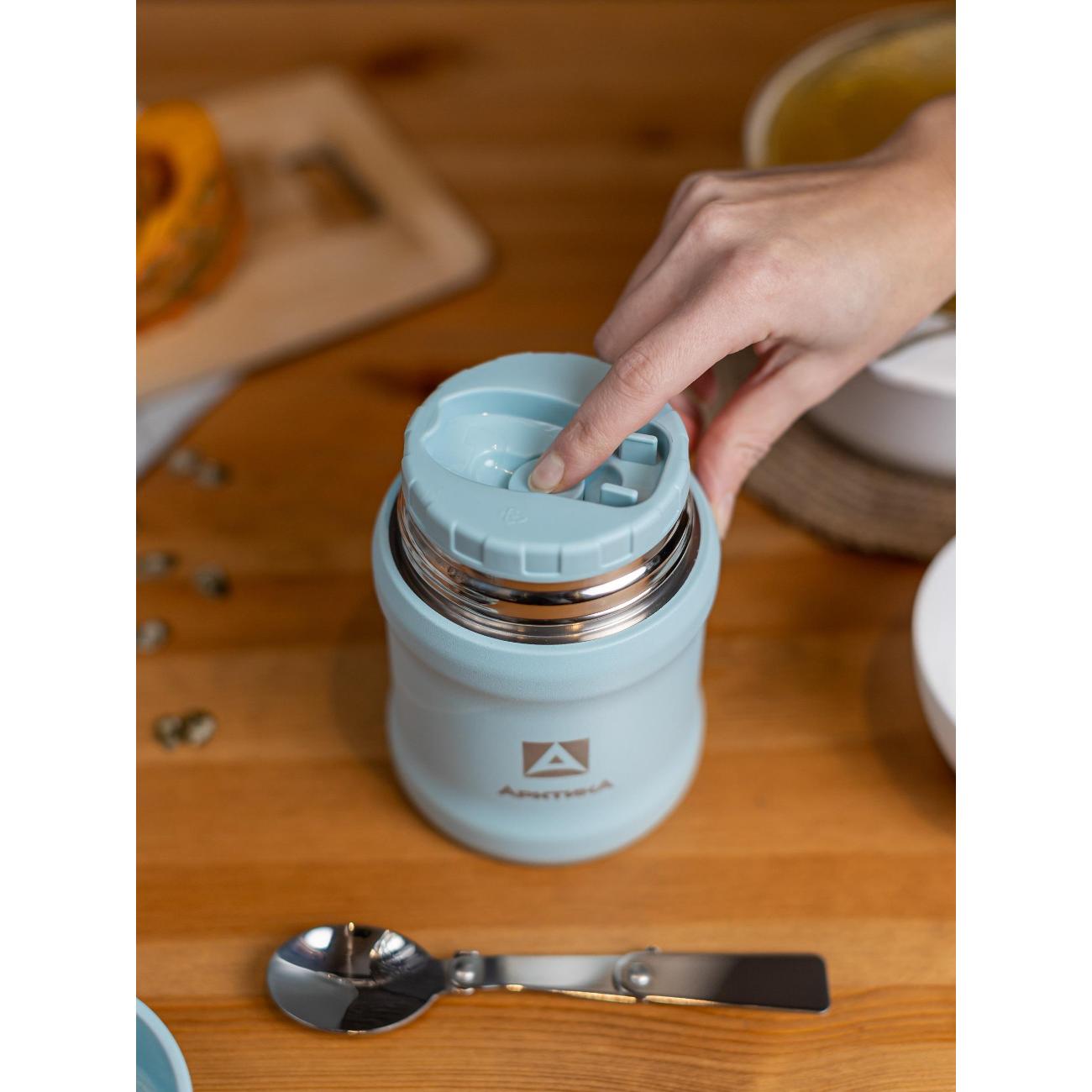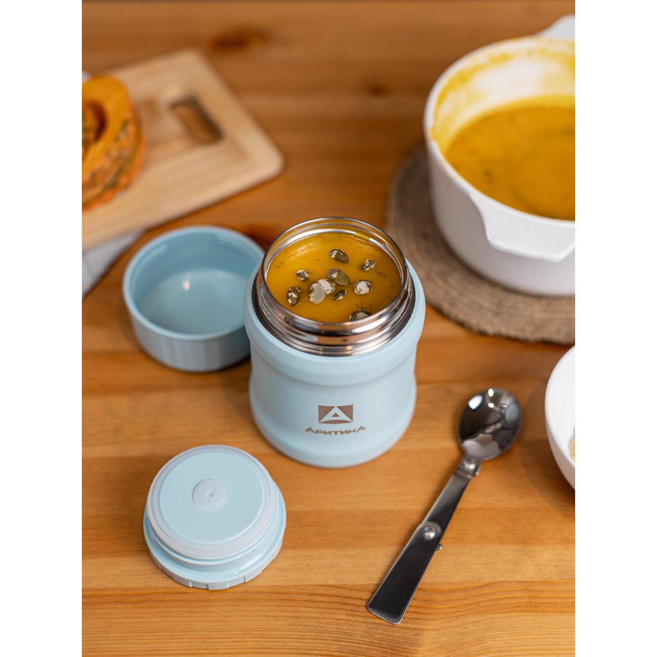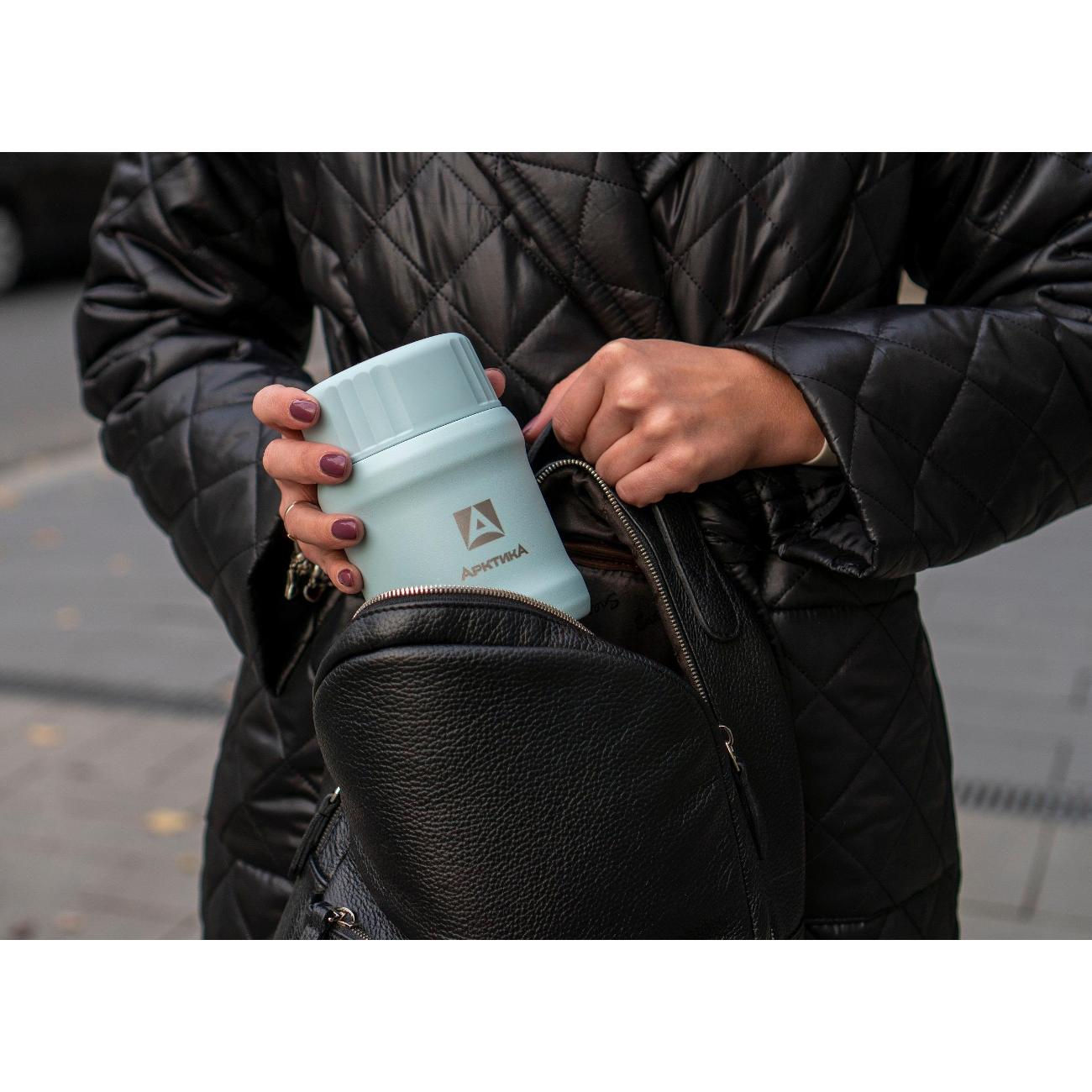 Термос «Арктика» 311-500-CN используется для сохранения или транспортировки пищи. Корпус и внутренняя колба модели изготовлены из нержавеющей стали. На пластиковой крышке расположена кнопка сброса давления, которая предотвращает присасывание. Термос помогает сберечь тепло на 12 ч, время сохранения холода составляет 24 ч. Конструкцией предусмотрено наличие широкого горлышка, что позволяет употреблять пищу прямо из термоса, не используя другую посуду. В комплекте прилагается складная ложка.