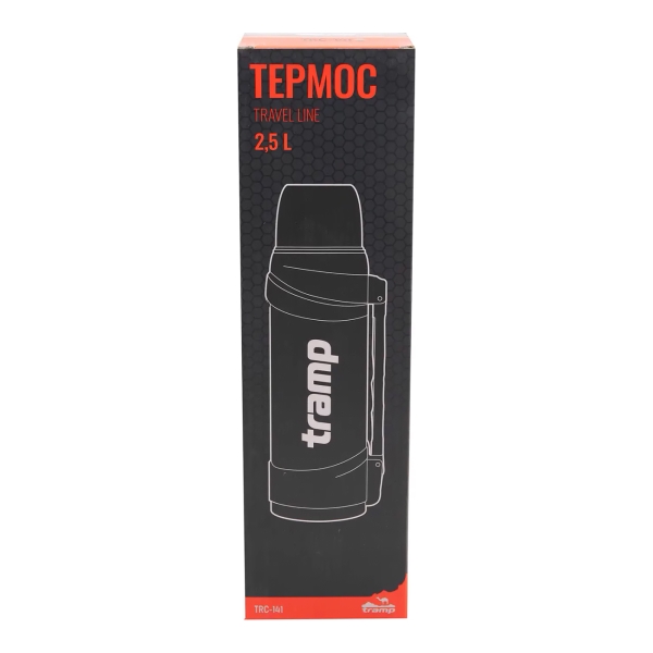Термос Tramp TRC-141 Travel-2500 объемом 2,5 л оснащен сетчатым фильтром, который позволяет заваривать чай, травы, ягоды непосредственно в колбе. Она выполнена из нержавеющей стали марки 18/8 и не влияет на вкус и аромат напитка. Пробка снабжена особым откидным механизмом, который позволяет не вынимать ее полностью при наливании жидкости. Чашкой может служить крышка, также в комплект входит еще одна пластиковая чашка. Термос оснащен ремнем для ношения.