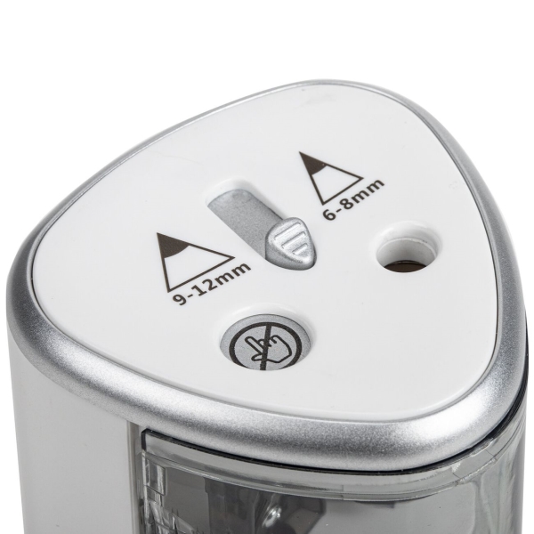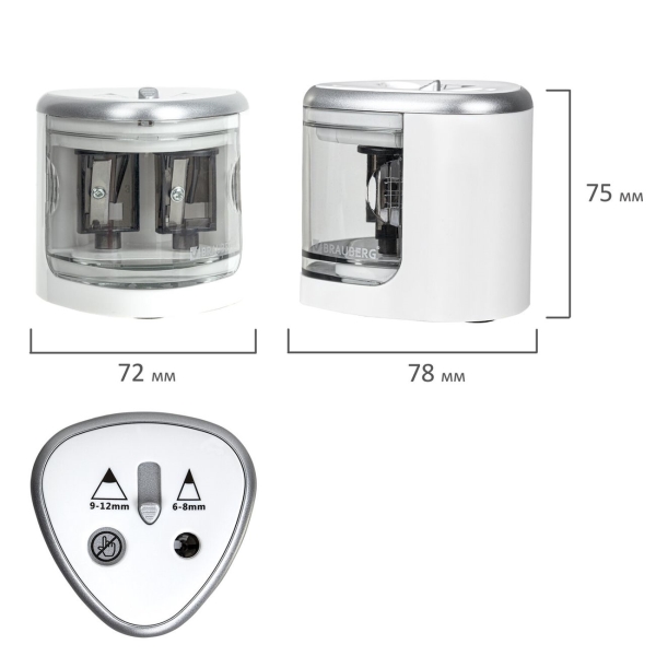 Электрическая точилка Brauberg с двумя отверстиями функционирует от четырех батареек АА. Также ее можно заряжать через сеть, используя кабель USB, который идет в комплекте. Она подходит для заточки черных или цветных карандашей, диаметр которых варьируется в диапазонах 6-8 мм и 9-12 мм. При их установке внутрь устройство начинает работать автоматически и останавливается, когда грифель достиг нужной степени остроты. Это дает возможность экономить заряд батарей и обеспечивает минимальный расход карандашей при стачивании. Емкость для стружек легко вынимается для очистки. Аксессуар не скользит на горизонтальной поверхности благодаря специальным ножкам.