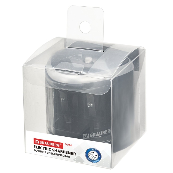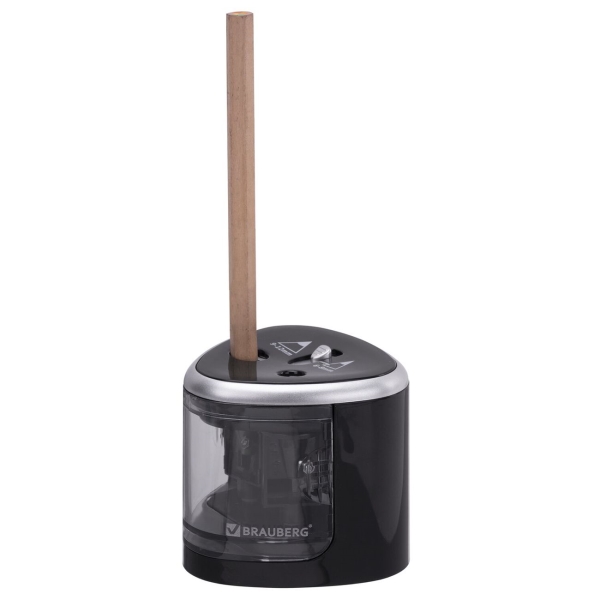 Электрическая точилка Brauberg с двумя отверстиями функционирует от четырех батареек АА. Также ее можно заряжать через сеть, используя кабель USB, который идет в комплекте. Она подходит для заточки черных или цветных карандашей, диаметр которых варьируется в диапазонах 6-8 мм и 9-12 мм. При их установке внутрь устройство начинает работать автоматически и останавливается, когда грифель достиг нужной степени остроты. Это дает возможность экономить заряд батарей и обеспечивает минимальный расход карандашей при стачивании. Емкость для стружек легко вынимается для очистки. Аксессуар не скользит на горизонтальной поверхности благодаря специальным ножкам.
