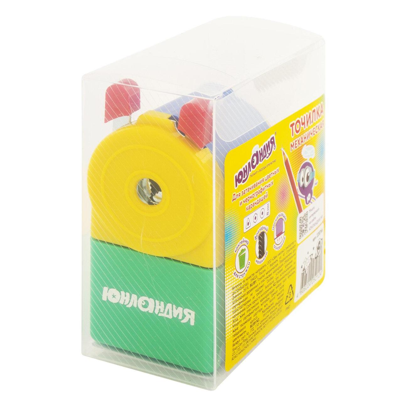 Корпус точилки выполнен из пластика в ярких цветах. Вращающийся роликовый нож из высококачественной стали обеспечивает быструю и острую заточку. Точилка имеет одно отверстие и вместительный контейнер для сбора стружки. Диаметр затачиваемого карандаша - 8 мм. Размер - 85х89х54 мм.