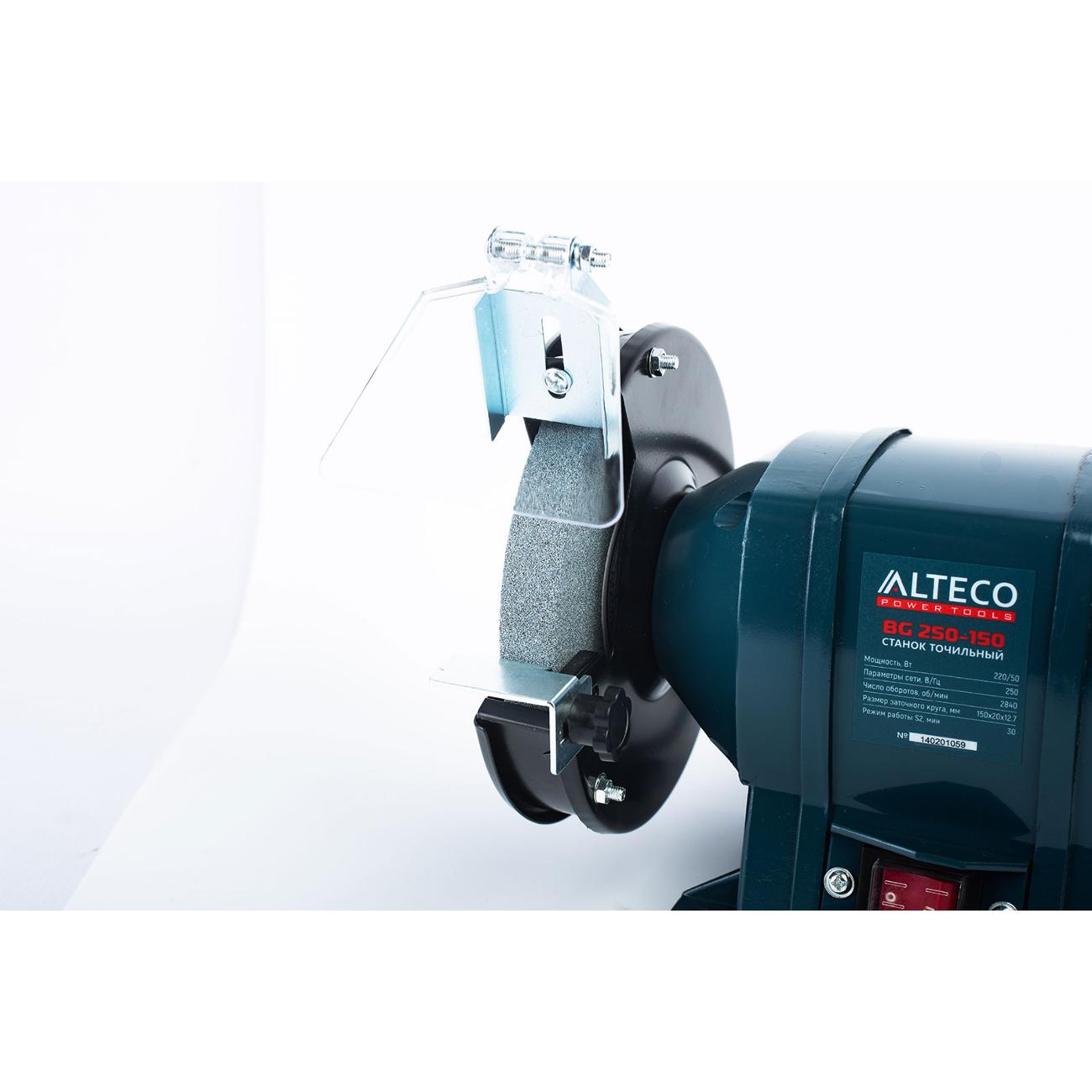 Точильный станок Alteco BG 250-150 оборудован асинхронным электромотором. Прибор работает на скорости с максимальным показателем 2850 об/мин. Модель оснащена двумя шлифовальными кругами. Максимальный диаметр насадки равен 150 мм, а ширина — 20 мм. Размер посадочного отверстия — 12,7 мм. Безопасность использования достигается наличием двух прозрачных экранов.