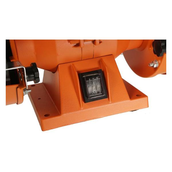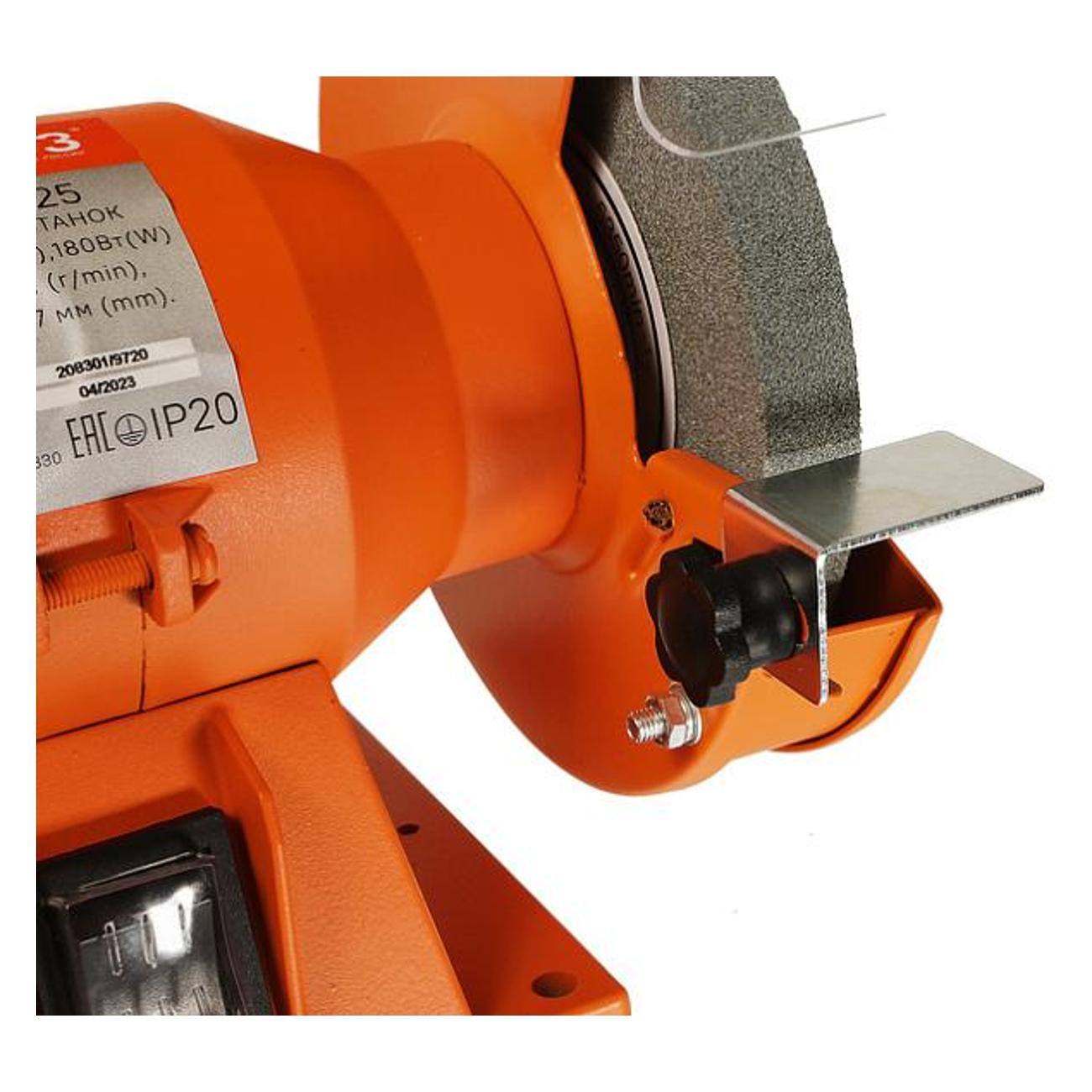 Прибор работает от сети, длина сетевого кабеля составляет 1,5 м. Потребляемая мощность — 180 Вт. Металлический корпус оснащен двумя рабочими упорами, искрогасителями и прозрачными экранами. Компактные размеры и удобная конструкция позволяют использовать инструмент в домашних условиях, на производстве или в мастерской. Цвет корпуса — оранжевый. Вес — 3,8 кг. Габаритные размеры — 20х28х18 см.