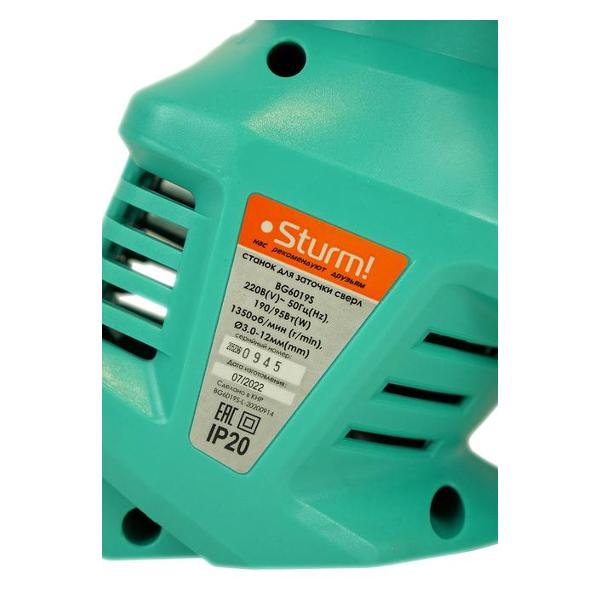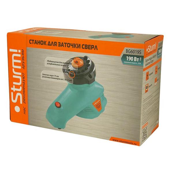 Точильный станок Sturm! BG6019S бирюзового цвета работает от сети. Длина шнура составляет 1 м. Мощность прибора — 0,19 кВт. Напряжение — 220 В. Корпус сделан из ударопрочного легкого пластика. Уровень шума во время работы не превышает 85 дБ. Габариты — 18х11х28 см. Вес изделия — 1,05 кг. Модель применяется для затачивания сверл диаметром от 3 до 19 мм. Число оборотов в минуту достигает 1350. Устройство может непрерывно работать в течение 20 минут. Диаметр посадочного отверстия составляет 5,85 см. Ширина большого круга — 1,5 см.
