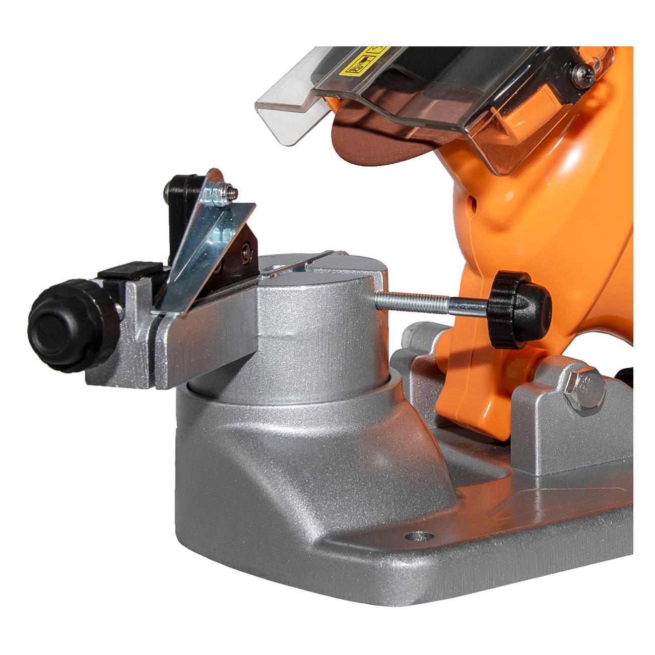 На корпусе станка установлен прозрачный защитный барьер, защищающий от попадания искр и стружки, и вентиляционные отверстия для предотвращения перегрева инструмента. На металлической подставке, которая используется для закрепления цепи, установлены два фиксирующих болта. Стол поворотный на величину до 30°.
