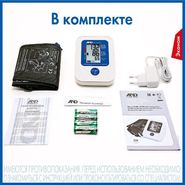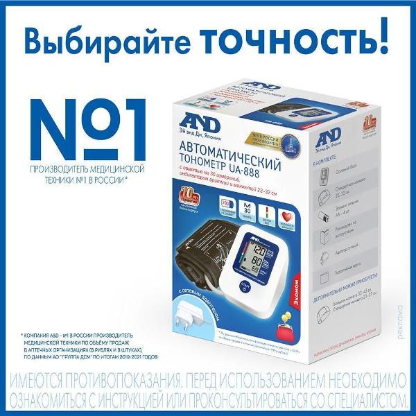 Тонометр AND UA-888 отличается механическим типом управления. Для включения и запуска измерения используется круглая синяя кнопка. Модель считывает сердечный ритм, пульс и показатели давления в диапазоне от 20 до 280 мм рт. ст. Погрешность составляет 3 мм. рт. ст. 30 последних результатов сохраняются в памяти, позволяя осуществлять динамический контроль. Информация выводится на ЖК-дисплей.