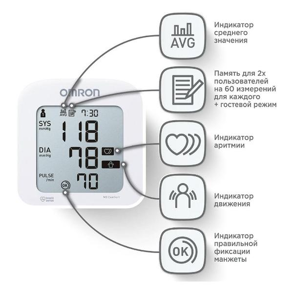 Тонометр Omron M3 Comfort представлен в пластиковом корпусе белого цвета. Это простой в использовании прибор, который оснащен индикатором правильной фиксации манжеты (на плечо). Широкие функциональные возможности позволяют использовать устройство в домашних условиях.