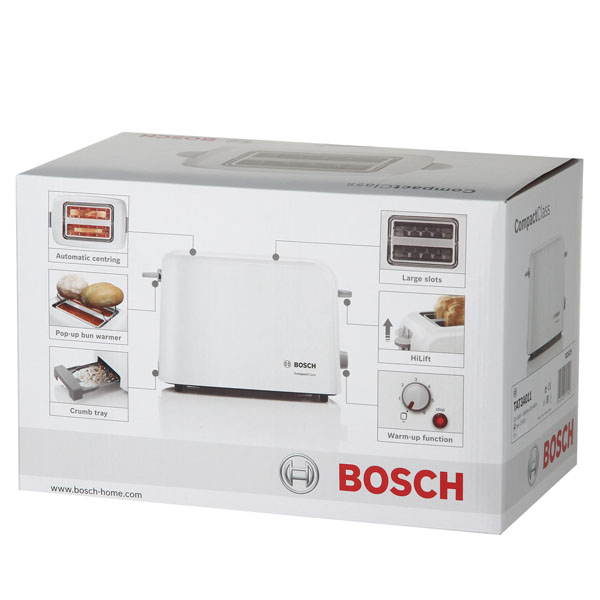 Тостер Bosch TAT3A011 использует систему автоматического центрирования. Она помогает обеим сторонам ломтиков получать необходимое количество тепла вне зависимости от их толщины. Благодаря этому готовые тосты получаются вкусными и хрустящими, а также не пригорают во время обработки.